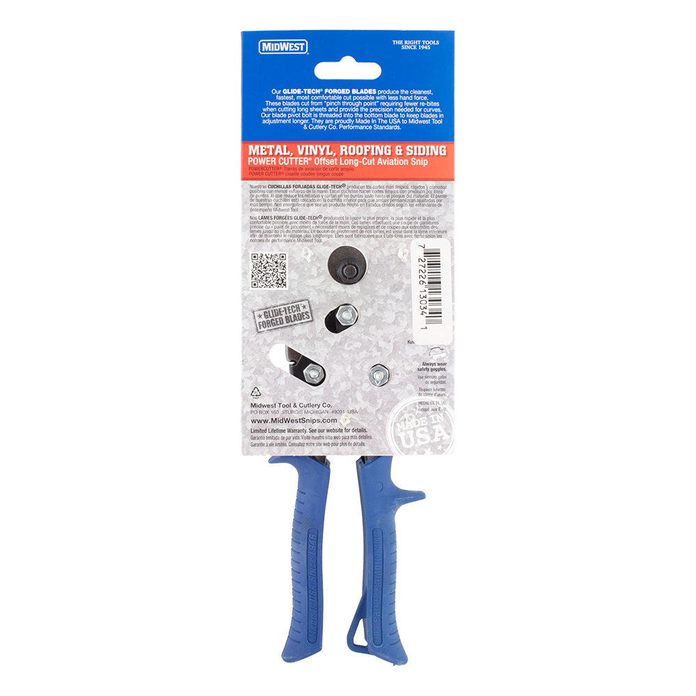 MIDWEST® POWER CUTTER® Offset Long Cut Aviation Snips feature 2.375″ length of cut for fewer rebites and are easier to maneuver when making long cuts, cutting ribbed materials, or cutting curves in full sheets of thin material. Use in either hand. These snips feature GLIDETECH® FORGED BLADES: unequaled strength, longest lasting edge life, and the most precise cutting action. Blades are hot drop forged of molybdenum alloy steel and Austemper® heat-treated to best accept and hold their precision ground cutting edge. Blades cut complete from “pinch of the blades through their points.” Equipped with KUSH’N-POWER® compound leverage handle action which multiplies handle force while providing a soft, sturdy and comfortable grip. Made in USA!