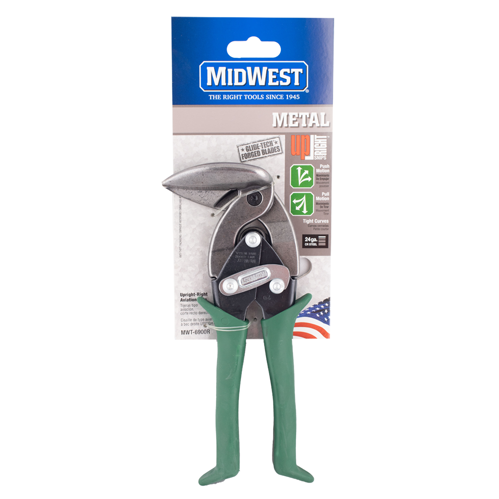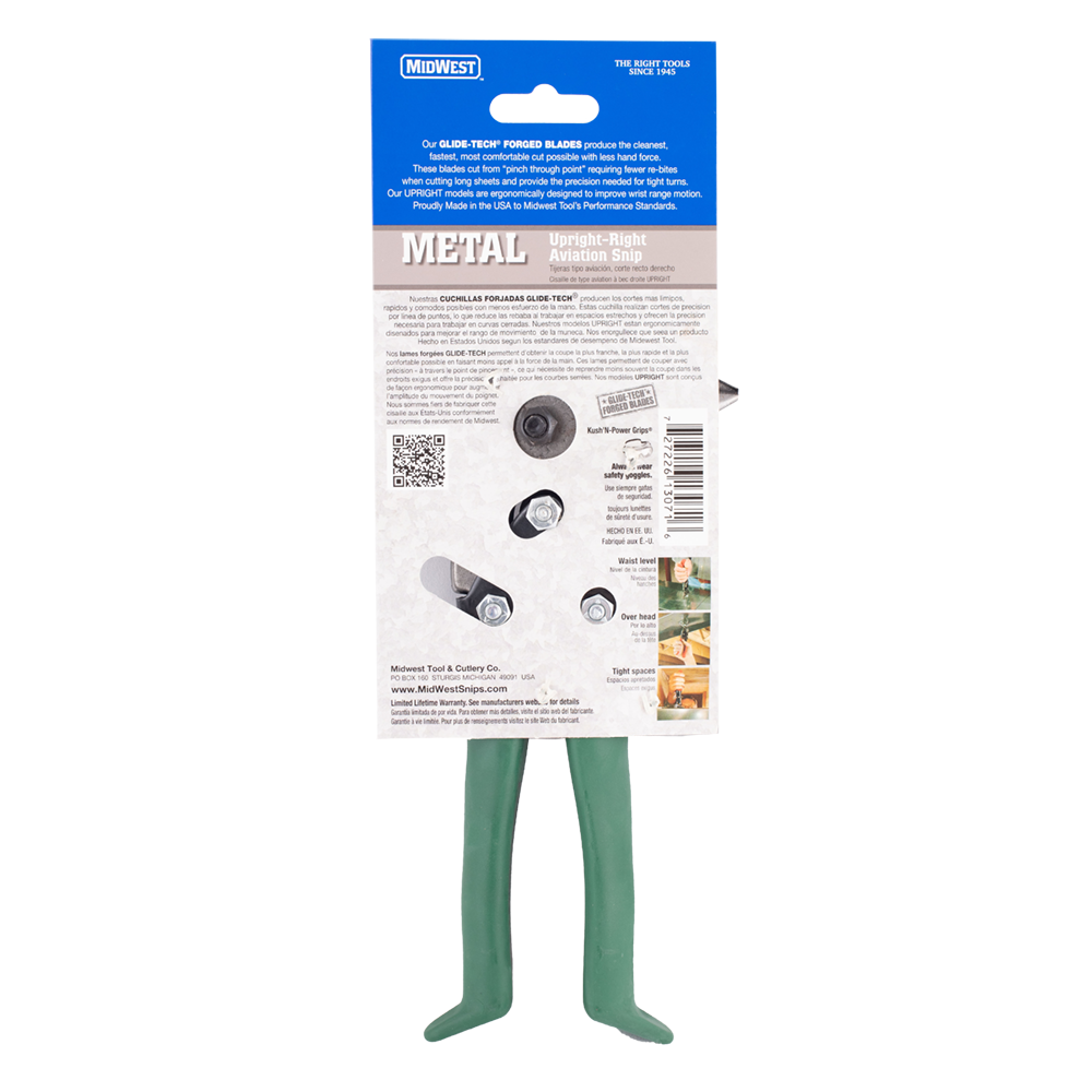 MIDWEST® UPRIGHT® Right Aviation Snips feature ergonomic handle action that reduces wrist range motion and fatigue. Can be used blades up or blades down with push or pull motion. Operates in tight spaces. Easiest used in left hand. These snips feature GLIDETECH® FORGED BLADES: unequaled strength, longest lasting edge life, and the most precise cutting action. Blades are hot drop forged of molybdenum alloy steel and Austemper® heat-treated to best accept and hold their precision ground cutting edge. Blades cut complete from “pinch of the blades through their points” and pivot on a Grade 8 bolt that is threaded and affixed into the bottom blade keeping blades in precision adjustment, and if ever necessary, allowing them to be readjusted extending peak performance. Equipped with KUSH’N-POWER® compound leverage handle action which multiplies handle force while providing a soft, sturdy and comfortable grip. Made in USA!