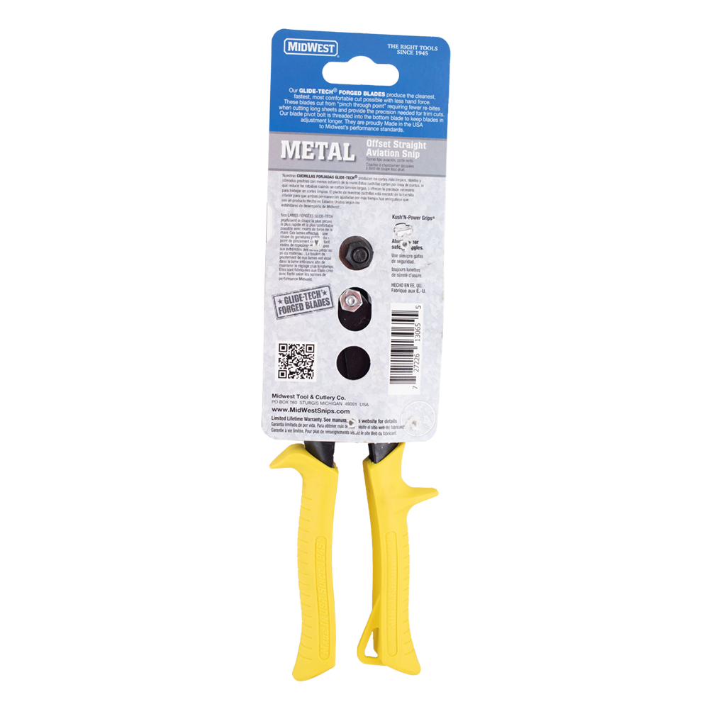 MIDWEST® Offset Straight Aviation Snips flow material away from the blades and position the user’s hand above the material for best maneuverability when making long cuts or wide curves. Used for cutting straight wide curves. Use in either hand. These snips feature GLIDETECH® FORGED BLADES: unequaled strength, longest lasting edge life, and the most precise cutting action. Blades are hot drop forged of molybdenum alloy steel and Austemper® heat-treated to best accept and hold their precision ground cutting edge. Blades cut complete from “pinch of the blades through their points” and pivot on a Grade 8 bolt that is threaded and affixed into the bottom blade keeping blades in precision adjustment, and if ever necessary, allowing them to be readjusted extending peak performance. Equipped with KUSH’N-POWER® compound leverage handle action which multiplies handle force while providing a soft, sturdy and comfortable grip. Made in USA!