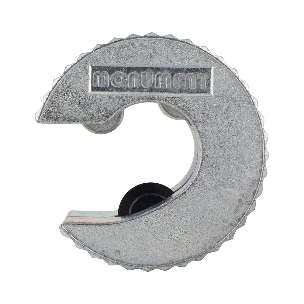 The Monument Autocut® Copper Pipe Cutter is designed for precise cutting of copper pipes. It features a zinc diecast body and a compact design suitable for use in confined spaces. The cutter clips onto the pipe and cuts in one direction only, producing a clean, square edge that reduces the risk of leaks and uneven joints. Each model is size-specific and will only cut the stated pipe diameter. Supplied with a preloaded, replaceable, heat-treated steel cutting wheel (spares available separately). Not suitable for stainless steel tubes. Made in Britain.