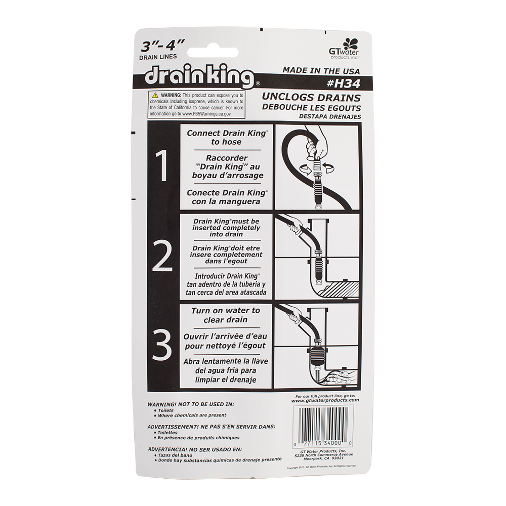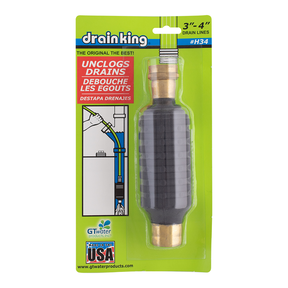 The Drain King H34 is a highly efficient and effective water-powered drain cleaner that is the perfect solution for clearing out all types of drains, from clean-out drains and main drains to sewer drains, basement drains, and even outside deck drains. As the original water-powered drain cleaner to ever enter the market, Drain King features a patented dispersing valve that makes it the first and only water-powered drain unclogger of its kind. The water-powered mechanism expands the Drain King from 3 to 4 inches, sealing the pipe, while water pulsating jets clear the clogged drain quickly up to 1000 feet. The best part is, Drain King operates and inflates with standard house water pressure of 40psi-80psi, ensuring that there is no danger of cracking your water pipes. Plus, with its automatic lock-in-valve, the unit locks in place, preventing it from sliding out of the pipe when in use. Drain King is proudly made in the USA and comes with a 1-year warranty.