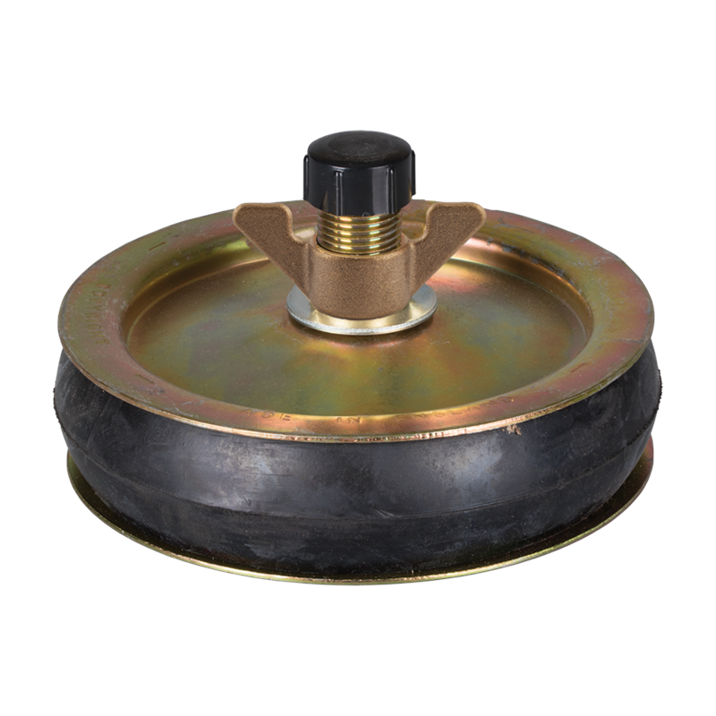 When inserted into the pipe end, tightening the wing nut of the central screw draws the farthest plate toward the front plate, pushing the rubber seal against the pipe wall to form a seal. The hollow screw can then be used as the test hose connector.