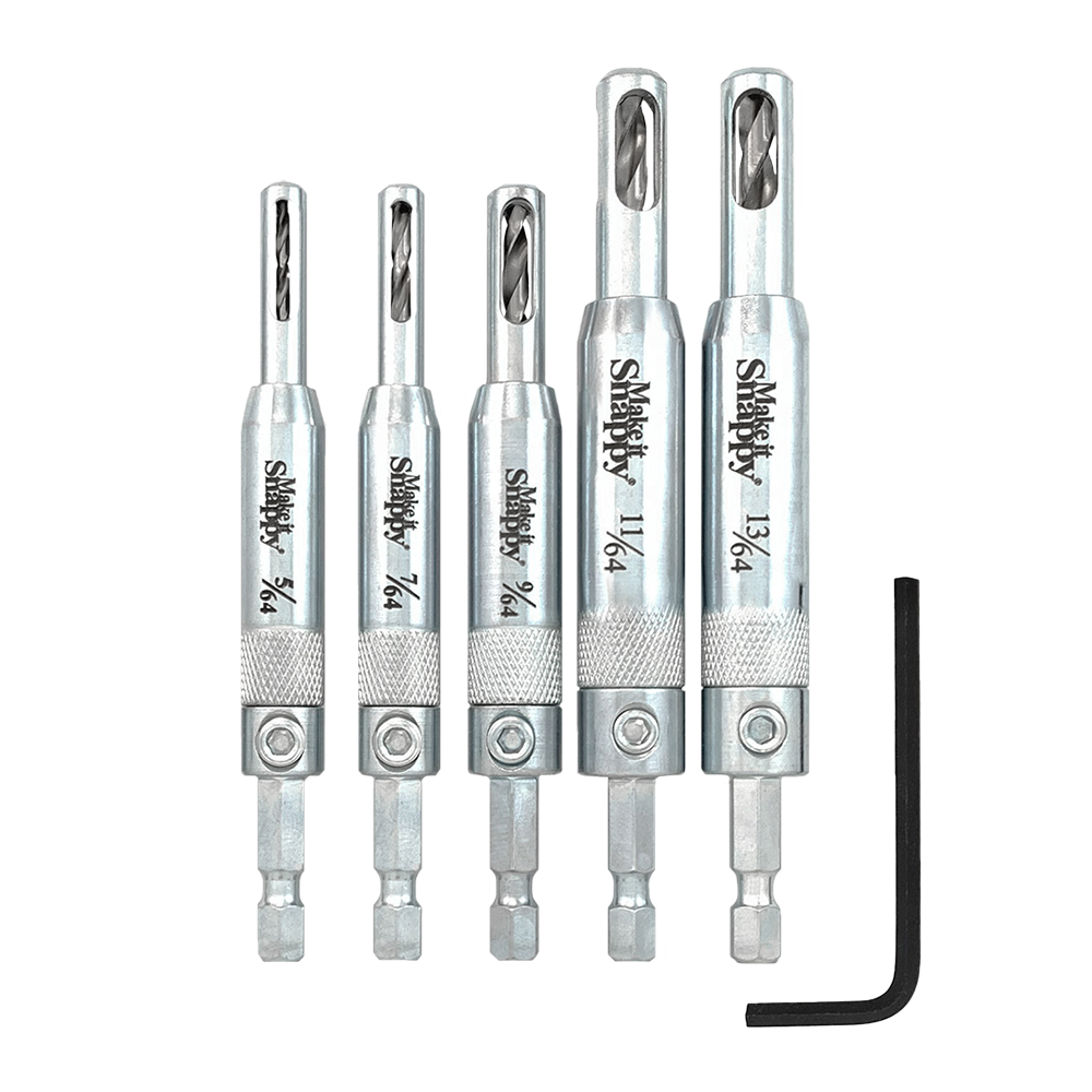 Use self-centering hinge bits to accurately drill pilot holes in hinges, handles, drawer slides and other hardware. Ensures screws will be straight and flush for proper mounting of hardware. The knurled barrel easily unscrews to clean out chips that may get into the tool’s body. Precision machined to work with Snappy™ quick change chucks or any tool designed to accept a 1/4” hex shank. The hardened nose bushing centers itself in hardware for a perfectly centered pilot hole. Made in the USA.