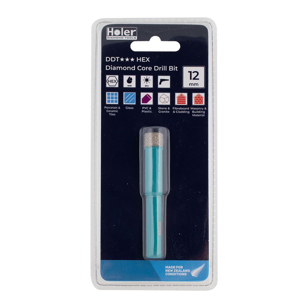 Holer Diamond Core Drill Bits are designed for cutting through tiles, glass, PVC, stone, fibreboard, cladding, masonry, and brick. Featuring a HEX shaft, they are compatible with conventional rotary drills and high-speed electric drills on non-hammer action. The vacuum brazed construction allows for dry use, while wax within the core tube provides cooling and lubrication during operation. Suitable for both wet and dry applications, these drill bits are built to perform reliably across diverse materials. Made for New Zealand conditions.