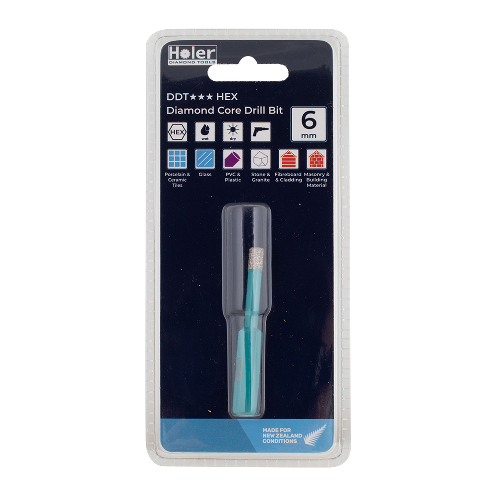 Holer Diamond Core Drill Bits are designed for cutting through tiles, glass, PVC, stone, fibreboard, cladding, masonry, and brick. Featuring a HEX shaft, they are compatible with conventional rotary drills and high-speed electric drills on non-hammer action. The vacuum brazed construction allows for dry use, while wax within the core tube provides cooling and lubrication during operation. Suitable for both wet and dry applications, these drill bits are built to perform reliably across diverse materials. Made for New Zealand conditions.