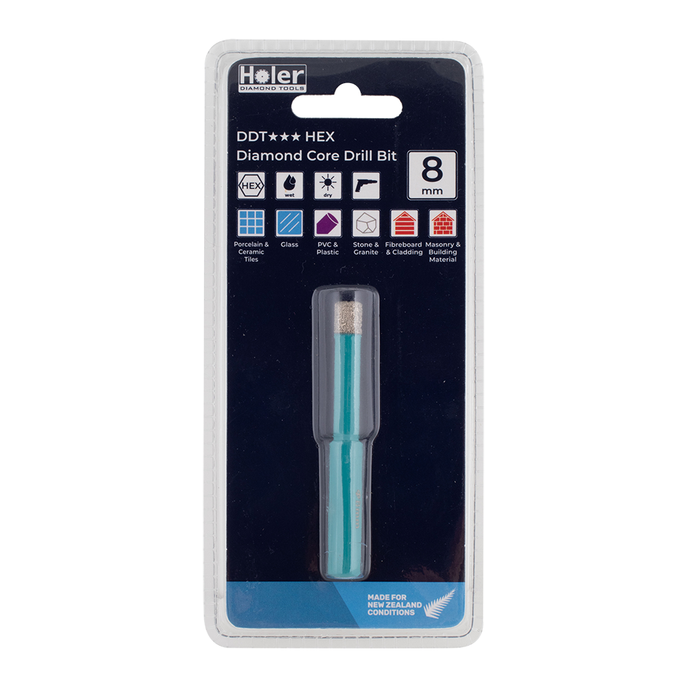 Holer Diamond Core Drill Bits are designed for cutting through tiles, glass, PVC, stone, fibreboard, cladding, masonry, and brick. Featuring a HEX shaft, they are compatible with conventional rotary drills and high-speed electric drills on non-hammer action. The vacuum brazed construction allows for dry use, while wax within the core tube provides cooling and lubrication during operation. Suitable for both wet and dry applications, these drill bits are built to perform reliably across diverse materials. Made for New Zealand conditions.
