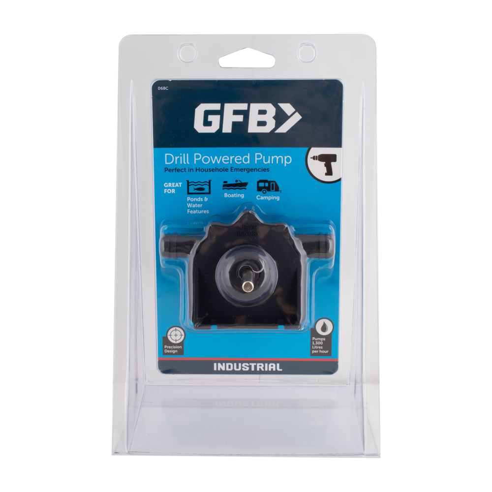 The GFB Drill Powered Pump fits into a toolbox and can be used for boating, ponds and water features, cellars, water tanks, and camping. It is essential in emergencies and can even be used with any non-flammable liquid, including oil. Efficient and easy to use, the pump features a 1/4" (6mm) shank and is fast-acting and self-priming. It offers impressive pumping rates: 1300 liters per hour at a 1-meter depth, 1200 liters per hour at a 2-meter depth, and 1000 liters per hour at a 3-meter depth. This pump ensures you are prepared for any situation.