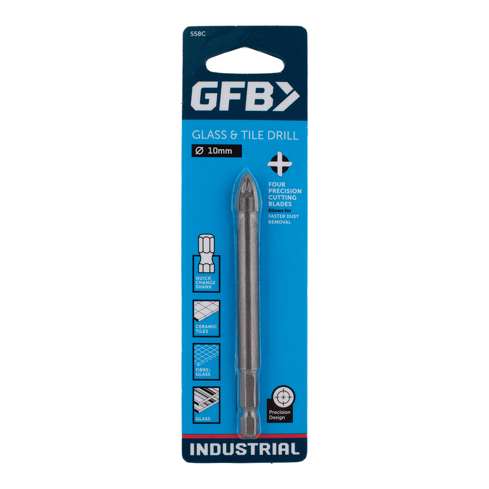 The GFB Glass & Tile Drills are crafted for precision and durability, featuring four sharp cutting blades that deliver clean cuts for optimal plug fitting and efficient dust removal. With a 1/4" Quick Change Shank, these bits integrate seamlessly with drills, enhancing versatility and convenience. Made from high-tensile steel, they are engineered for industrial toughness and precision, making them ideal for drilling through ceramic tiles, fibreglass, and glass. For best results, always use lubrication when drilling to achieve a smooth, even finish and to extend tool life.