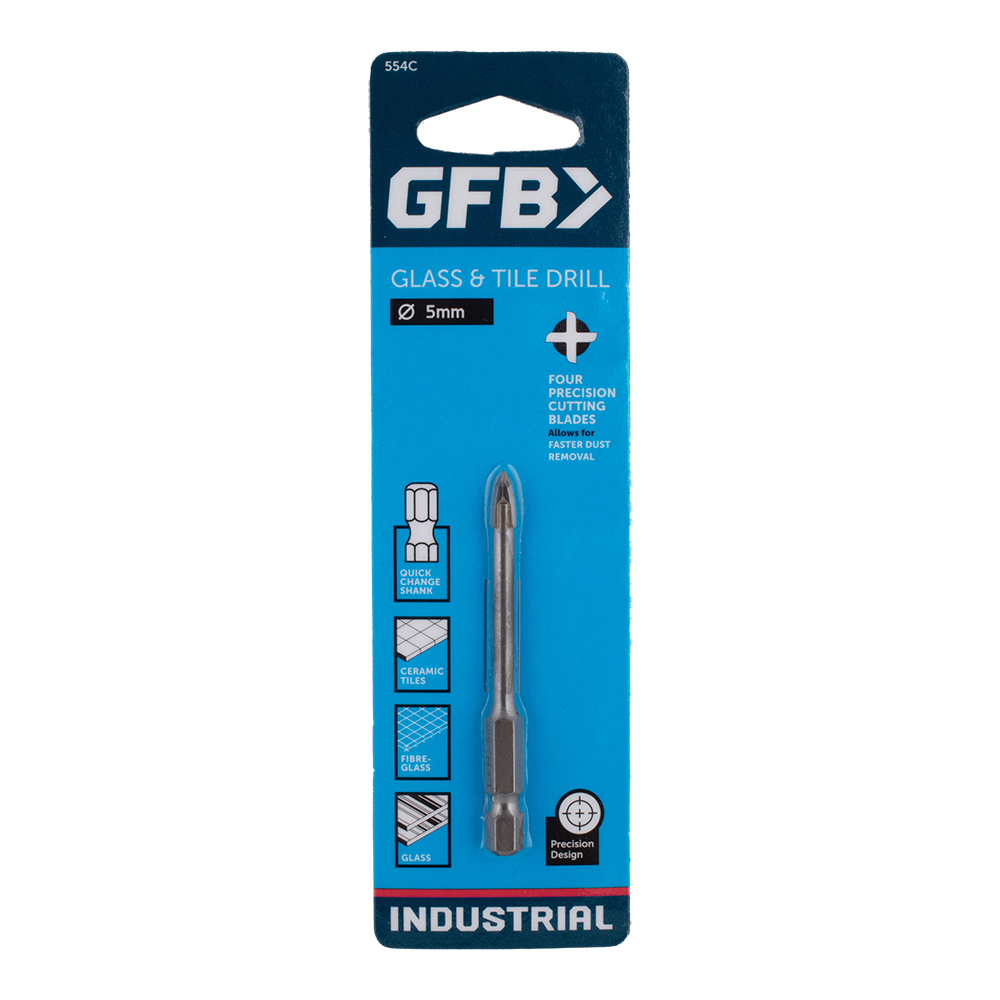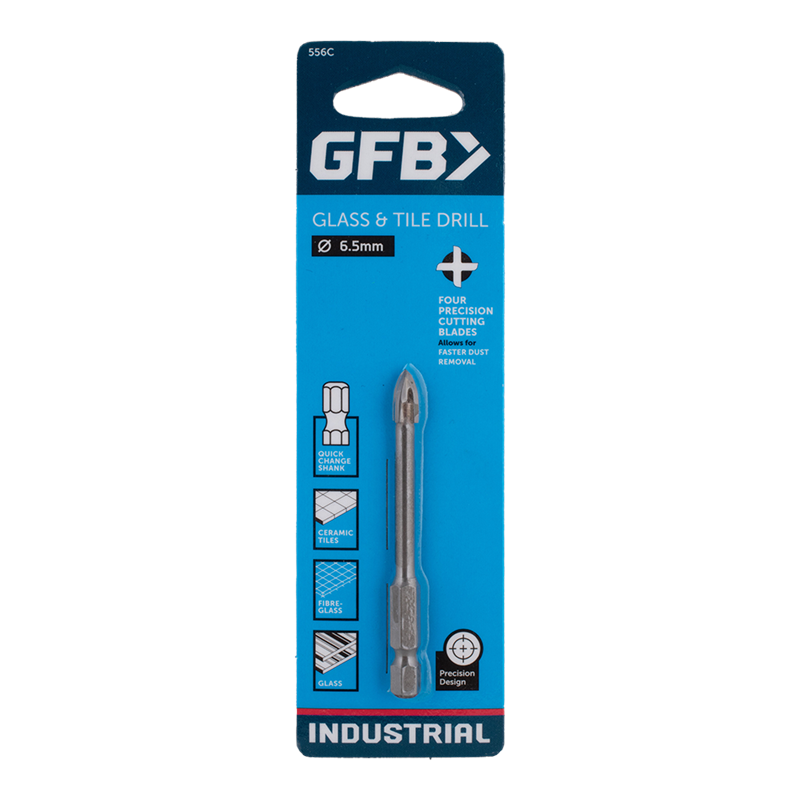The GFB Glass & Tile Drills are crafted for precision and durability, featuring four sharp cutting blades that deliver clean cuts for optimal plug fitting and efficient dust removal. With a 1/4" Quick Change Shank, these bits integrate seamlessly with drills, enhancing versatility and convenience. Made from high-tensile steel, they are engineered for industrial toughness and precision, making them ideal for drilling through ceramic tiles, fibreglass, and glass. For best results, always use lubrication when drilling to achieve a smooth, even finish and to extend tool life.