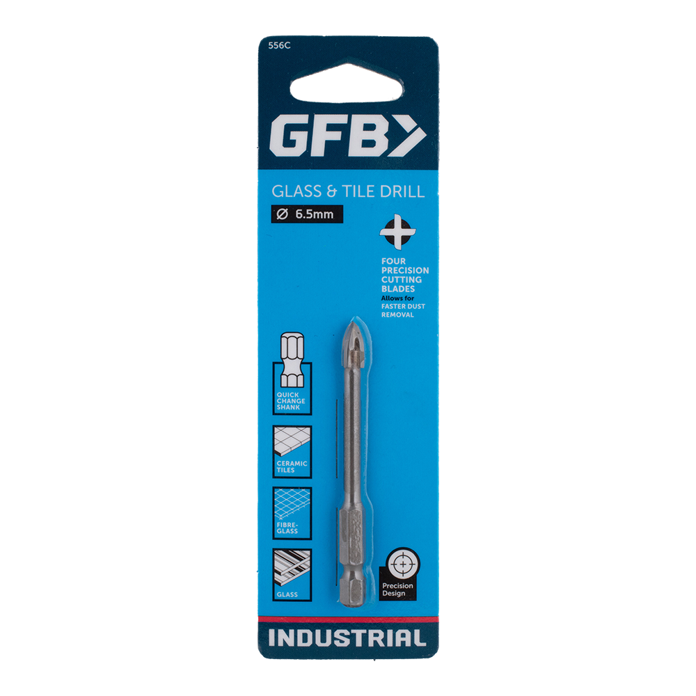 The GFB Glass & Tile Drills are crafted for precision and durability, featuring four sharp cutting blades that deliver clean cuts for optimal plug fitting and efficient dust removal. With a 1/4" Quick Change Shank, these bits integrate seamlessly with drills, enhancing versatility and convenience. Made from high-tensile steel, they are engineered for industrial toughness and precision, making them ideal for drilling through ceramic tiles, fibreglass, and glass. For best results, always use lubrication when drilling to achieve a smooth, even finish and to extend tool life.