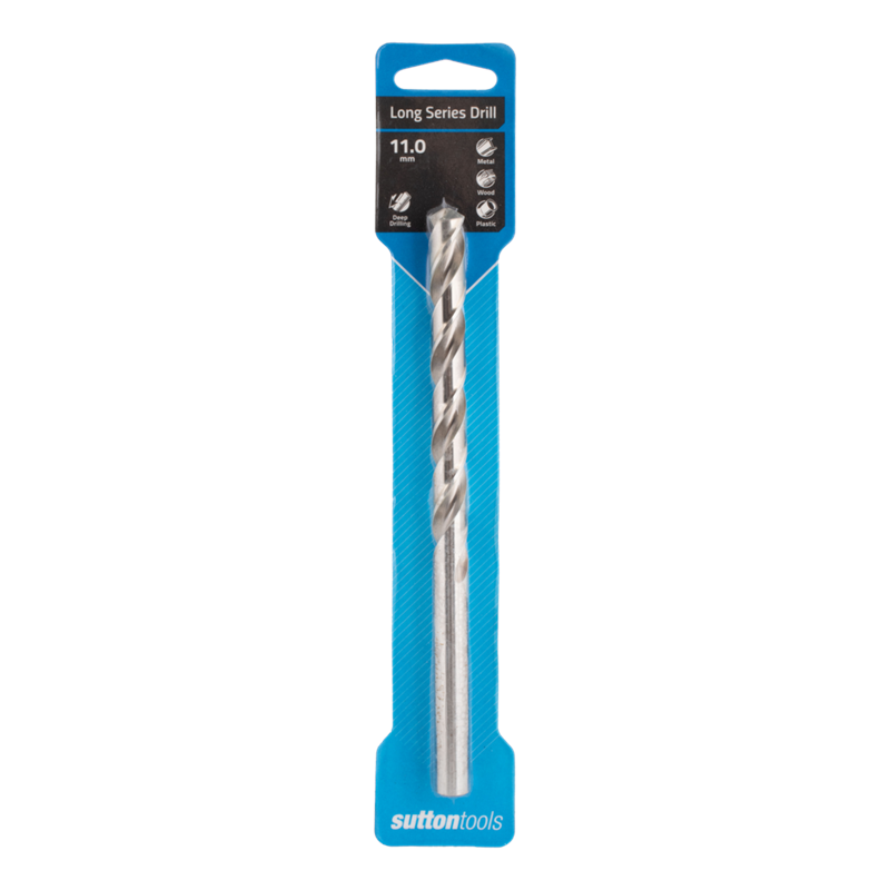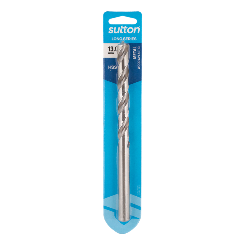 Sutton HSS Long Series Drill Bits feature extended flute and overall lengths, ideal for deeper hole drilling and longer reach applications. With a 118° standard point, they are perfect for general purpose tasks. The precision ground flute ensures fast chip removal, enhancing efficiency. Made from M2 high-speed steel, these bits provide an excellent balance of strength, heat, and wear resistance. Their bright finish makes them versatile for use on steel, aluminum, wood, and plastic, ensuring reliable performance across various materials.
