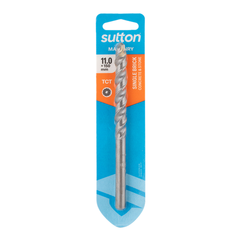 Sutton Tools TCT Masonry Drill Bits offer tradesman quality and efficiency for drilling into natural and artificial stone, masonry, brickwork, and concrete. Featuring a Tungsten Carbide percussion tip with a semi-positive profile, they achieve 25% faster drilling. The Tungsten Carbide cutting edges ensure high wear resistance, while the rolled double spiral flute enhances dust extraction, tripling drill life. A unique brazing process secures the tip to the body, and the parallel shank supports rotary hammer and percussion drilling. Crafted with a length of 150mm, perfect for drilling deeper holes. An ISO 14001 sandblasted finish guarantees zero heavy metals.