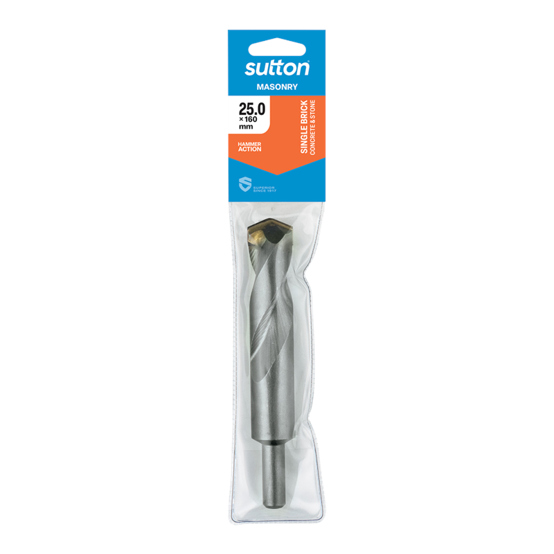 Sutton Tools TCT Masonry Drill Bits offer tradesman quality and efficiency for drilling into natural and artificial stone, masonry, brickwork, and concrete. Featuring a Tungsten Carbide percussion tip with a semi-positive profile, they achieve 25% faster drilling. The Tungsten Carbide cutting edges ensure high wear resistance, while the rolled double spiral flute enhances dust extraction, tripling drill life. A unique brazing process secures the tip to the body, and the parallel shank supports rotary hammer and percussion drilling. Crafted with a length of 150mm, perfect for drilling deeper holes. An ISO 14001 sandblasted finish guarantees zero heavy metals.