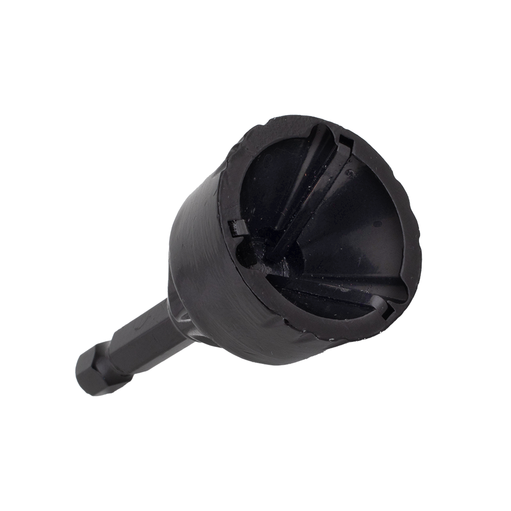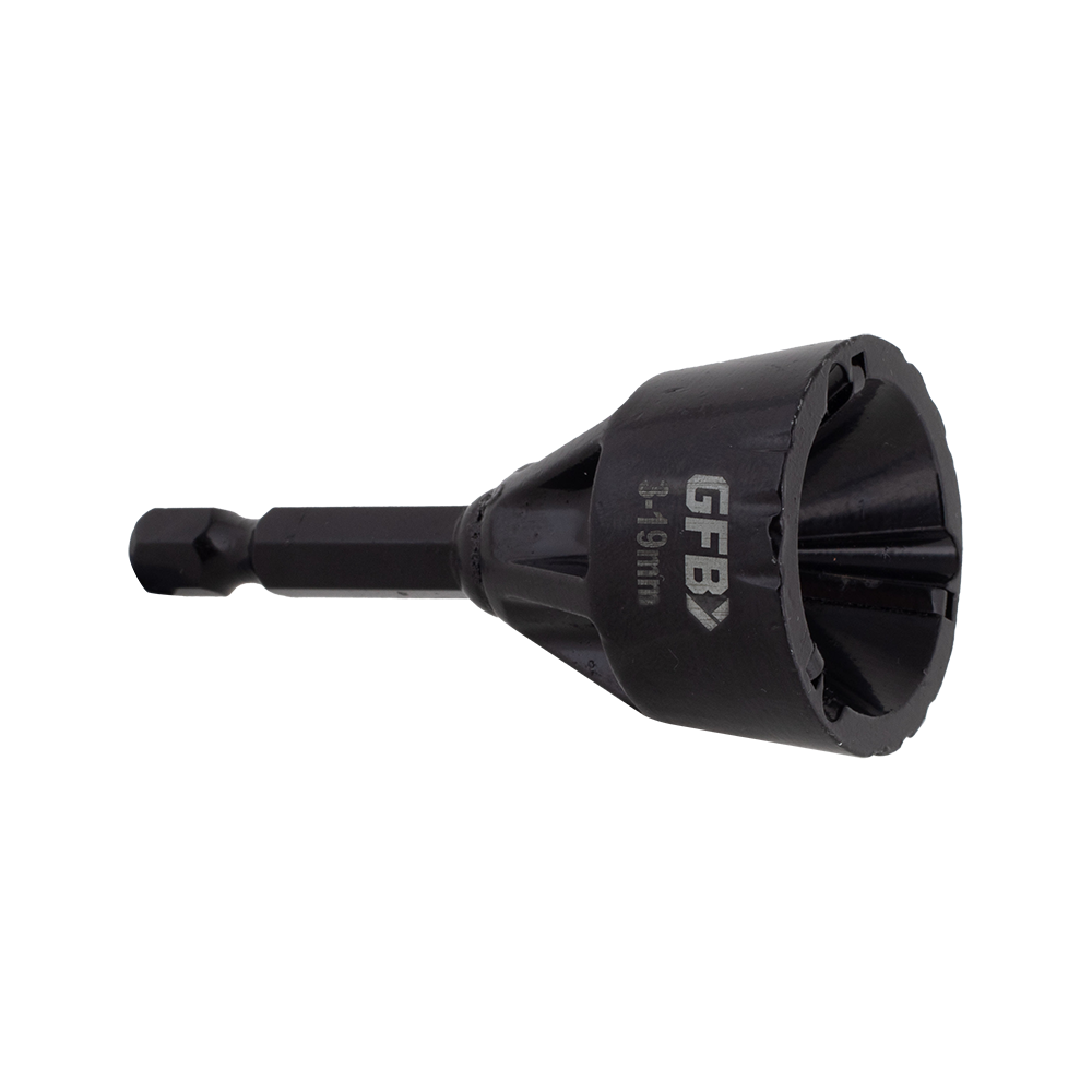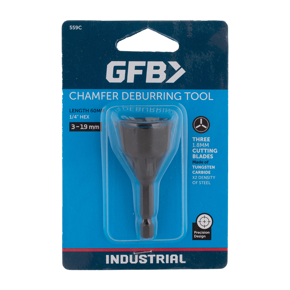 The GFB Chamfer Deburring Tool is designed to quickly cut external chamfers on the ends of bolts or threaded rods, making it a versatile tool for various applications. It efficiently deburrs the ends of steel, iron, and brass rods, as well as timber dowels and plastic rods, with a diameter range of 3-19mm. Equipped with three 1.8mm tungsten carbide blades, which are twice as dense as steel, this tool ensures durability and precision. Its internal cutting edge enhances safety, while the 1/4" hex shank allows for quick change. For optimal performance, use at a low speed of 400 RPM to prolong its lifespan.