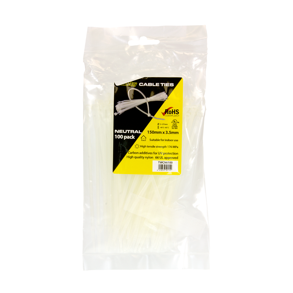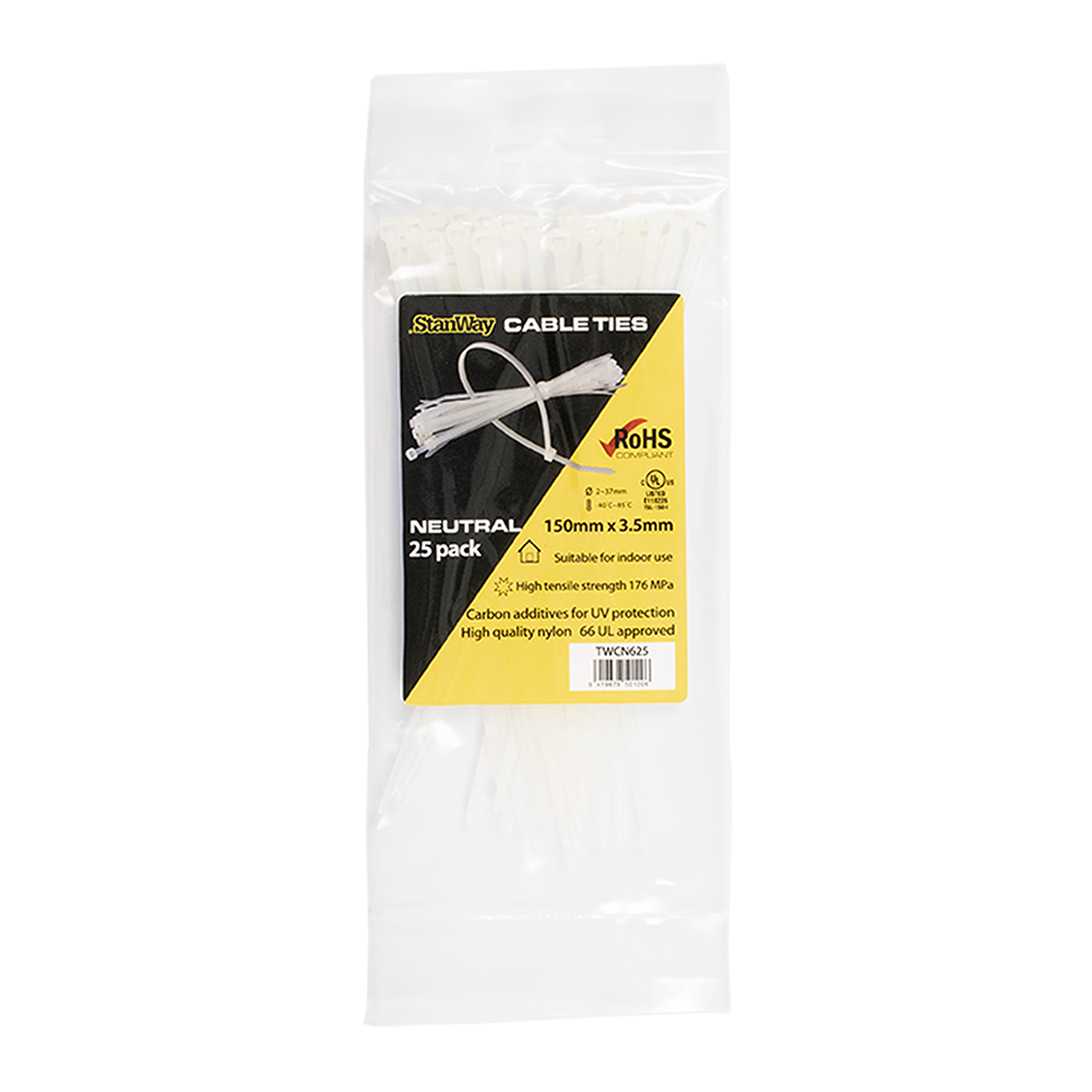 The Stanway Black Cable Ties are perfect for keeping cables, wires, and items neatly bundled and organised in the home, office, garden, worksite or workshop. Made from high-quality Nylon 6/6, they feature a one-piece injection-moulded construction for excellent tensile strength. These durable ties are rated UL 94V-2 for flame resistance and operate in temperatures from -40°C to 85°C. They are suitable for both indoor and outdoor use. Ideal for a wide range of general-purpose fastening and organising tasks.