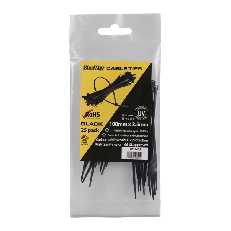 The Stanway Natural Cable Ties are ideal for bundling and organising cables, wires, and items around the home, office, worksite or workshop. Made from high-quality Nylon 6/6, they feature a one-piece injection-moulded construction for strong tensile strength and reliable performance. Rated UL 94V-2 for flame resistance and suitable for temperatures from -40°C to 85°C, these ties offer durability for indoor use. Perfect for general-purpose fastening and organising tasks, they provide a neat, secure, and long-lasting solution wherever reliable indoor cable management is needed.