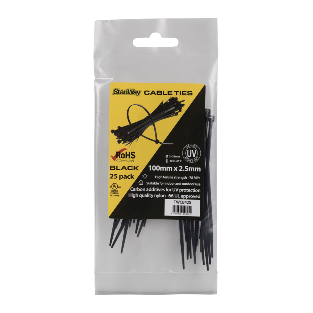 STANWAY UV Black Cable Tie (100mm x 2.5mm) - 25 Pack