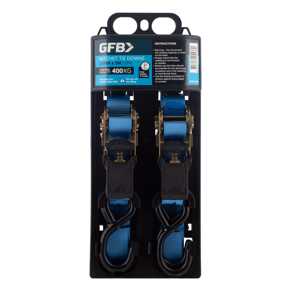 GFB Ratchet Tie Downs offer heavy-duty reliability for securing loads with minimal effort. Designed to meet AS/NZS 4380.2001 standards, they are ideal for securing large loads. Equipped with Vinyl Coated 'S' Hooks, these tie-downs are versatile for various industries and domestic applications, including ute and truck trays, trailers, and roof racks. Each strap measures 25mm in width and 5m in length, with a lashing capacity of 400kg. Made from high-strength nylon strapping, they are perfect for tradesmen, truck drivers, farmers, and handymen. Comes in a pack of 2.