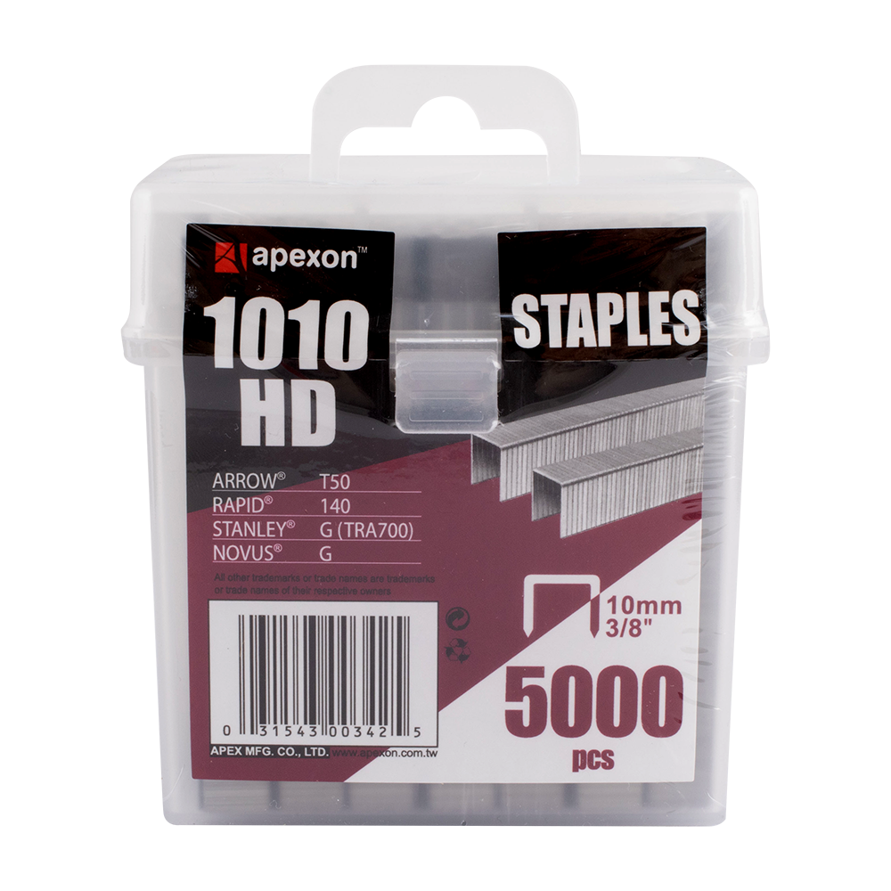 The Apexon 10mm heavy duty staples excel in all heavy-duty stapling tasks, boasting superior quality and durability. Measuring 10mm in length (3/8”), with a crown width of 10.8mm and a thickness of 1.25mm, these staples are perfectly suited for Apexon heavy duty staplers and hammer tackers (refer to packaging for compatibility details). They are also interchangeable with Arrow T50 and Rapid 140 models. Coated in zinc galvanization, these staples offer exceptional resilience and longevity for demanding stapling applications. These come packaged in a durable plastic case, enhancing their protection and reducing the risk of staple breakage during storage and transport.