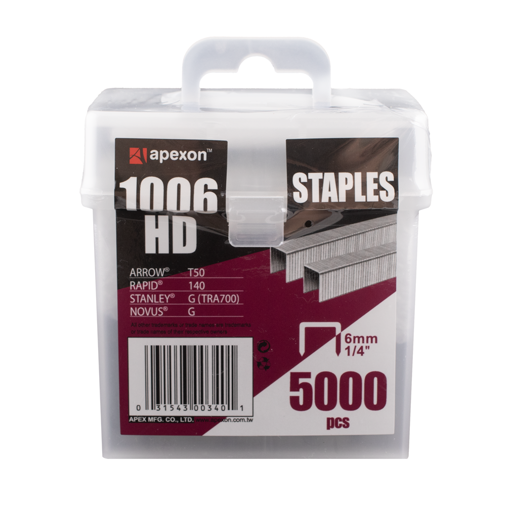 The Apexon 6mm heavy duty staples excel in all heavy-duty stapling tasks, boasting superior quality and durability. Measuring 6mm in length (1/4”), with a crown width of 10.8mm and a thickness of 1.25mm, these staples are perfectly suited for Apexon heavy duty staplers and hammer tackers (refer to packaging for compatibility details). They are also interchangeable with Arrow T50 and Rapid 140 models. Coated in zinc galvanization, these staples offer exceptional resilience and longevity for demanding stapling applications. These come packaged in a durable plastic case, enhancing their protection and reducing the risk of staple breakage during storage and transport.