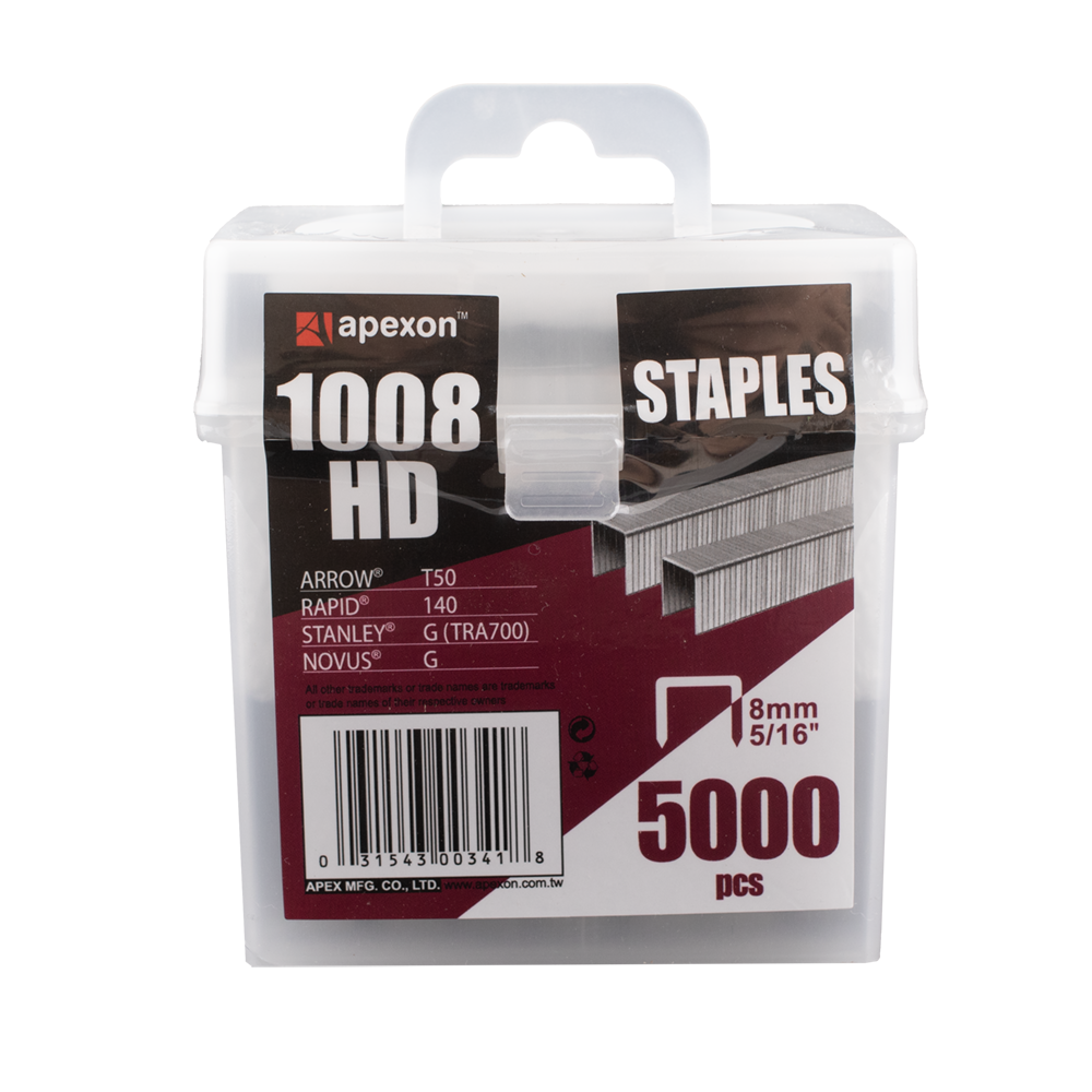The Apexon 8mm heavy duty staples excel in all heavy-duty stapling tasks, boasting superior quality and durability. Measuring 8mm in length (5/16”), with a crown width of 10.8mm and a thickness of 1.25mm, these staples are perfectly suited for Apexon heavy duty staplers and hammer tackers (refer to packaging for compatibility details). They are also interchangeable with Arrow T50 and Rapid 140 models. Coated in zinc galvanization, these staples offer exceptional resilience and longevity for demanding stapling applications. These come packaged in a durable plastic case, enhancing their protection and reducing the risk of staple breakage during storage and transport.