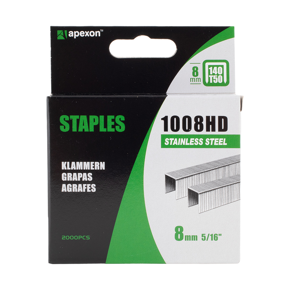 The Apexon 8mm heavy duty staples excel in all heavy-duty stapling tasks, boasting superior quality and durability. Measuring 8mm in length (5/16”), with a crown width of 10.8mm and a thickness of 1.25mm, these staples are perfectly suited for Apexon heavy duty staplers and hammer tackers (refer to packaging for compatibility details). They are also interchangeable with Arrow T50 and Rapid 140 models. Coated in zinc galvanization, these staples offer exceptional resilience and longevity for demanding stapling applications. These come packaged in a durable plastic case, enhancing their protection and reducing the risk of staple breakage during storage and transport. Additionally, the case is equipped with a convenient belt clip, allowing for effortless transportation and storage.