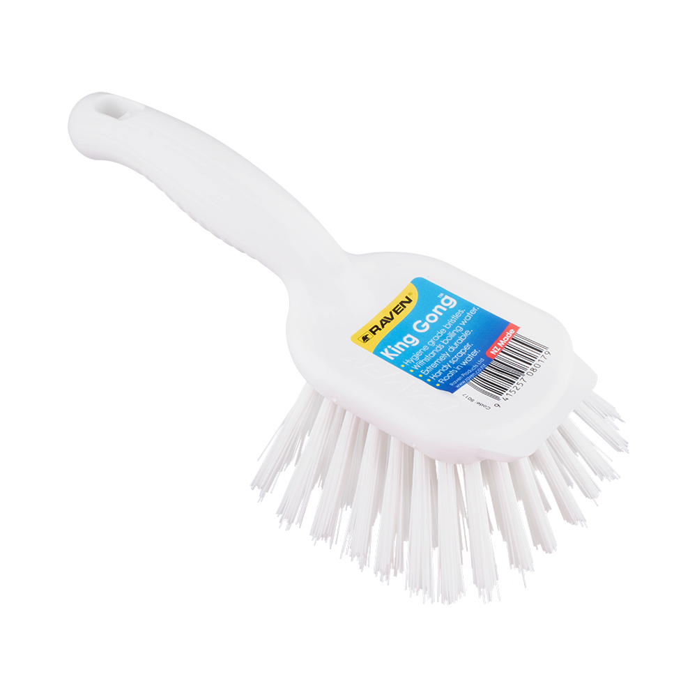 The Raven King Gong Scrub Brush is the go-to choice for commercial kitchens, dairy facilities, and the food industry. Its hygiene-grade bristles ensure thorough cleanliness, capable of withstanding boiling water. This durable brush includes a convenient scraper for tackling tough residues, while its floating design makes it easy to retrieve from water. With long, angled bristles adept at reaching tricky spots, it promises comprehensive cleaning. Proudly 100% New Zealand owned, it's a trusted essential for maintaining impeccable hygiene standards in professional environments.