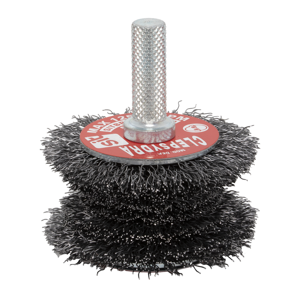 Small circular brush shaped as per SIT patent with shank 10x28mm - 3/8” x 1-1/8”, knorled for firmer tightening. The shape serves as a guide for easier use. Faster, more effective paint stripping and rust removal operations on pipes, curved profiles and edges.