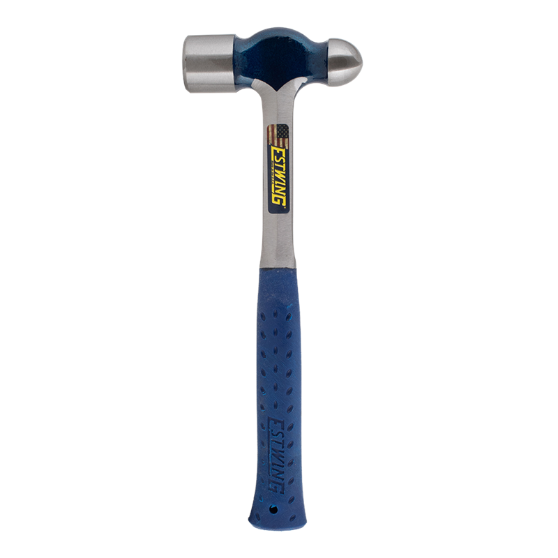 The Estwing Ball Pein Hammer is forged in one solid piece of American steel for maximum strength and durability. It features a fully polished head with a smooth face, suitable for metalworking tasks such as shaping metal, peening rivets, and rounding edges. The bonded and moulded Shock Reduction Grip® is made of nylon-vinyl and reduces vibration caused by impact by up to 70%. This grip is permanently attached and provides added comfort and control. The one-piece construction ensures long-lasting performance in workshop and industrial settings. Made in the U.S.A.