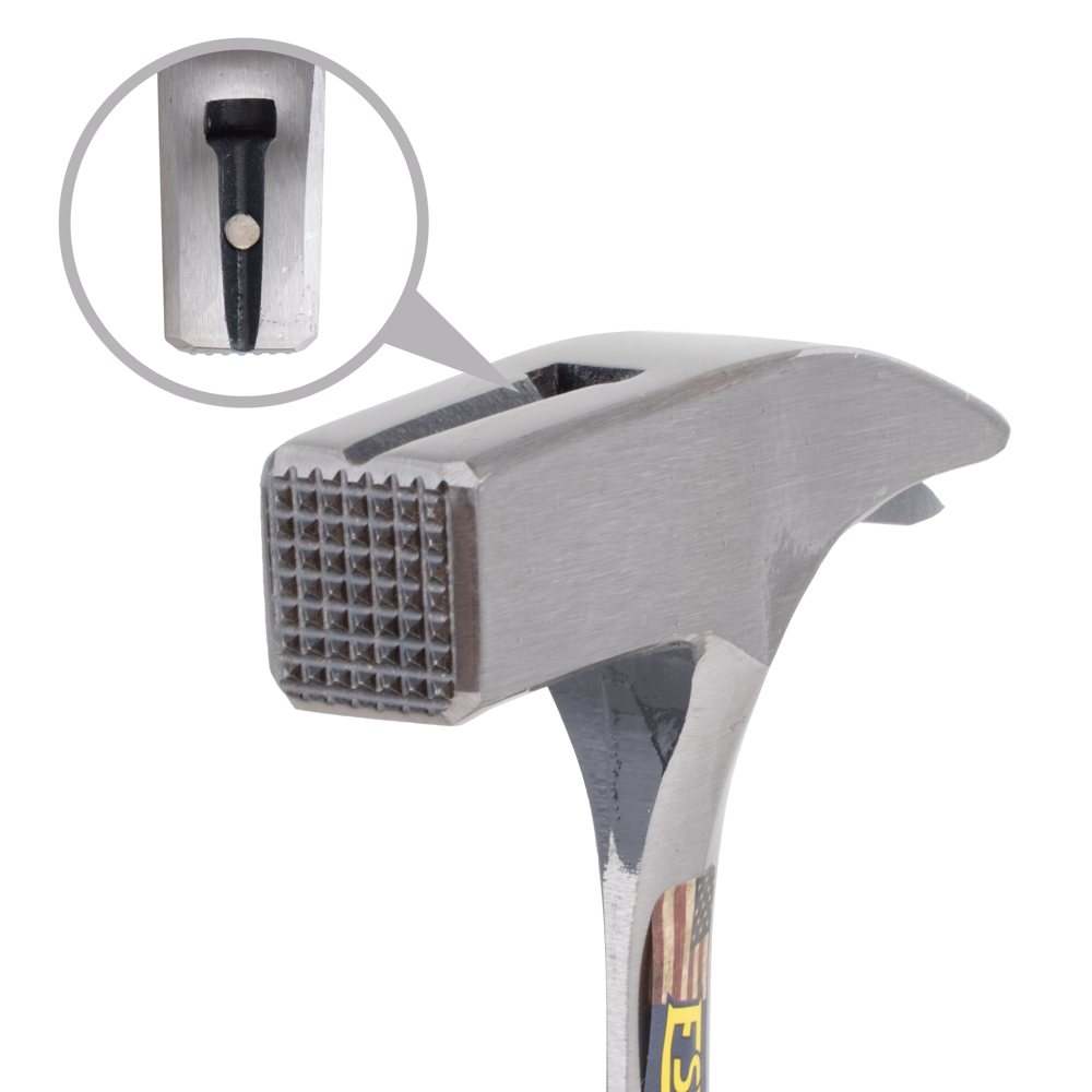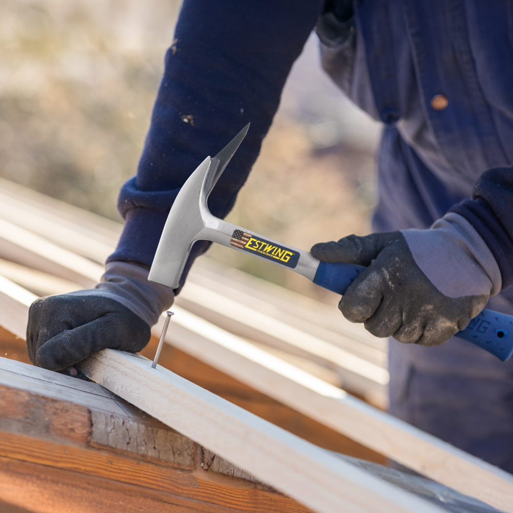 The Estwing German Pattern Latthammer is a precision-engineered roofing hammer commonly used in roofing and scaffold building. Forged from a single piece of American steel, it offers maximum strength and durability, with a fully polished head and milled face for superior traction on nails. It features a square head for accurate nail placement in corners and a built-in magnetic nail starter for one-handed operation. The bonded and moulded Shock Reduction Grip®, made of durable nylon-vinyl, reduces vibration impact by up to 70%. Its asymmetrical single-claw design functions as a nail puller, scraper, hole maker for slate tiles, and general-purpose prying tool.
