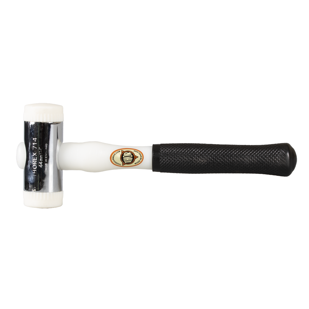 Faces are designed to wear and to be replaced by hand. All faces are one piece moulded. No metal pegs or inserts to damage the workpiece when worn. Serrations in the metal head prevent faces coming loose during use. Faces have a shoulder for extra strength and to prevent fracture from misdirected blows. Used due to the easily interchangeable heads; as a multi purpose striking tool in most assembly applications including engineering; furniture; shop fitting; partitioning; double glazing; injection moulding dies etc. Faces are designed to wear and can be replaced.