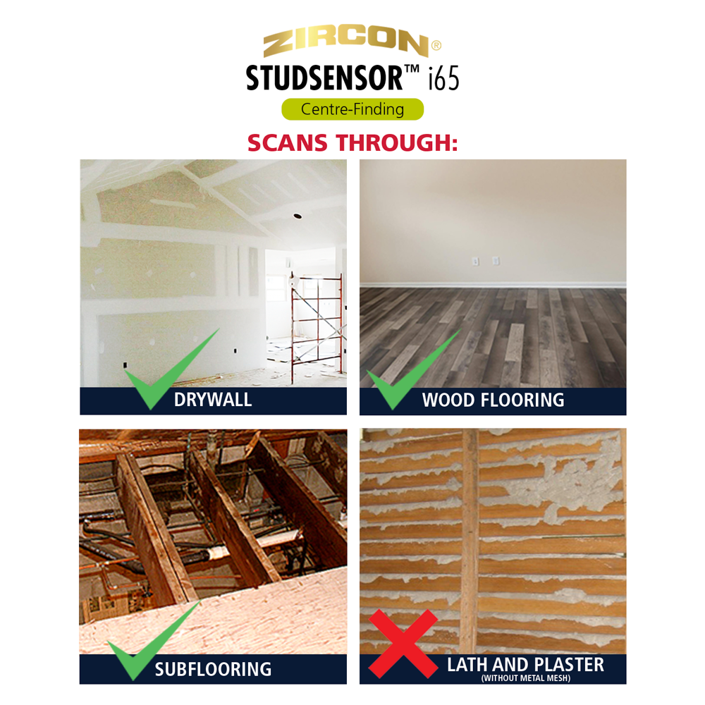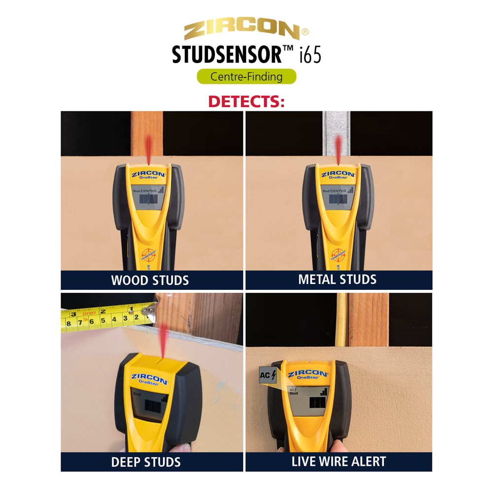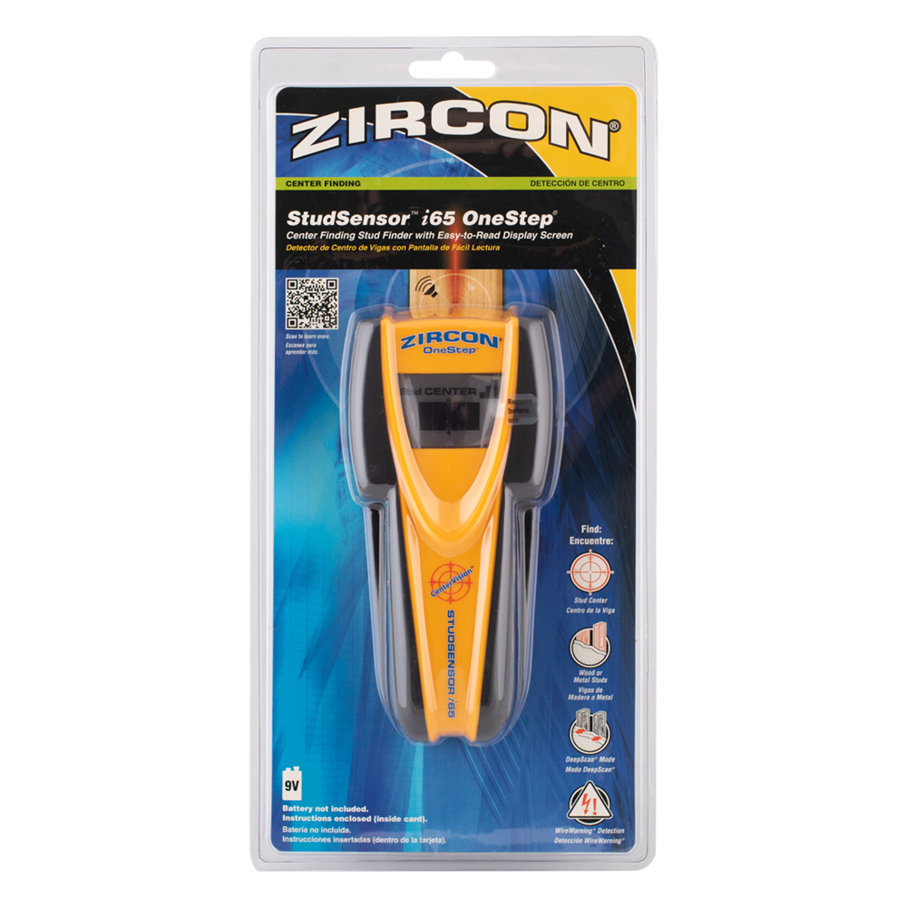 StudSensor™ i65 OneStep® quickly and easily locates the edges and center of wood and metal studs and joists behind walls, floors, and ceilings. Patented CenterVision® technology finds the center of studs in a single pass. Its easy-to-read display screen indicates directions, edges and center of studs, while WireWarning® detection indicates the presence of live AC voltage.