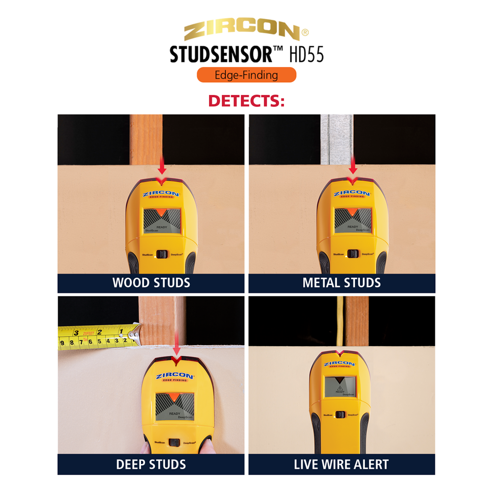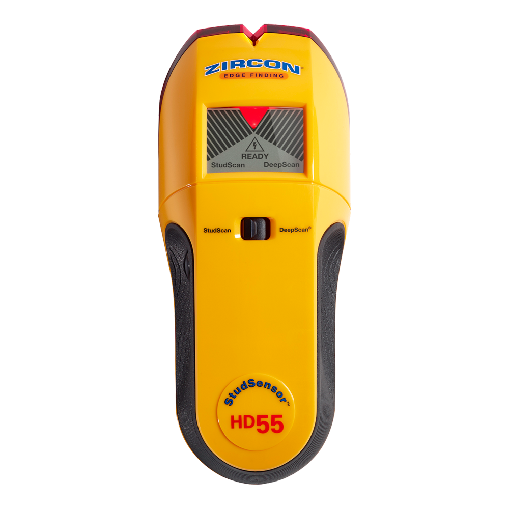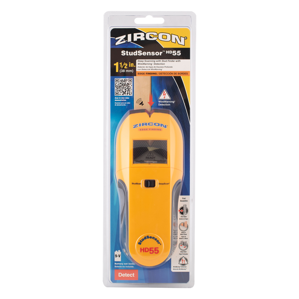 The StudSensor™ HD55 deep-scanning stud finder boasts more design innovations by Zircon. Featuring an enhanced LCD display, it debuts a new Target Spotlight that illuminates on-screen when you’ve found the edge of a stud. Select from two stud scan modes to find the edges of wood and metal studs to securely anchor mirrors, shelves, and cabinets to the wall while also avoiding live AC electrical wiring.