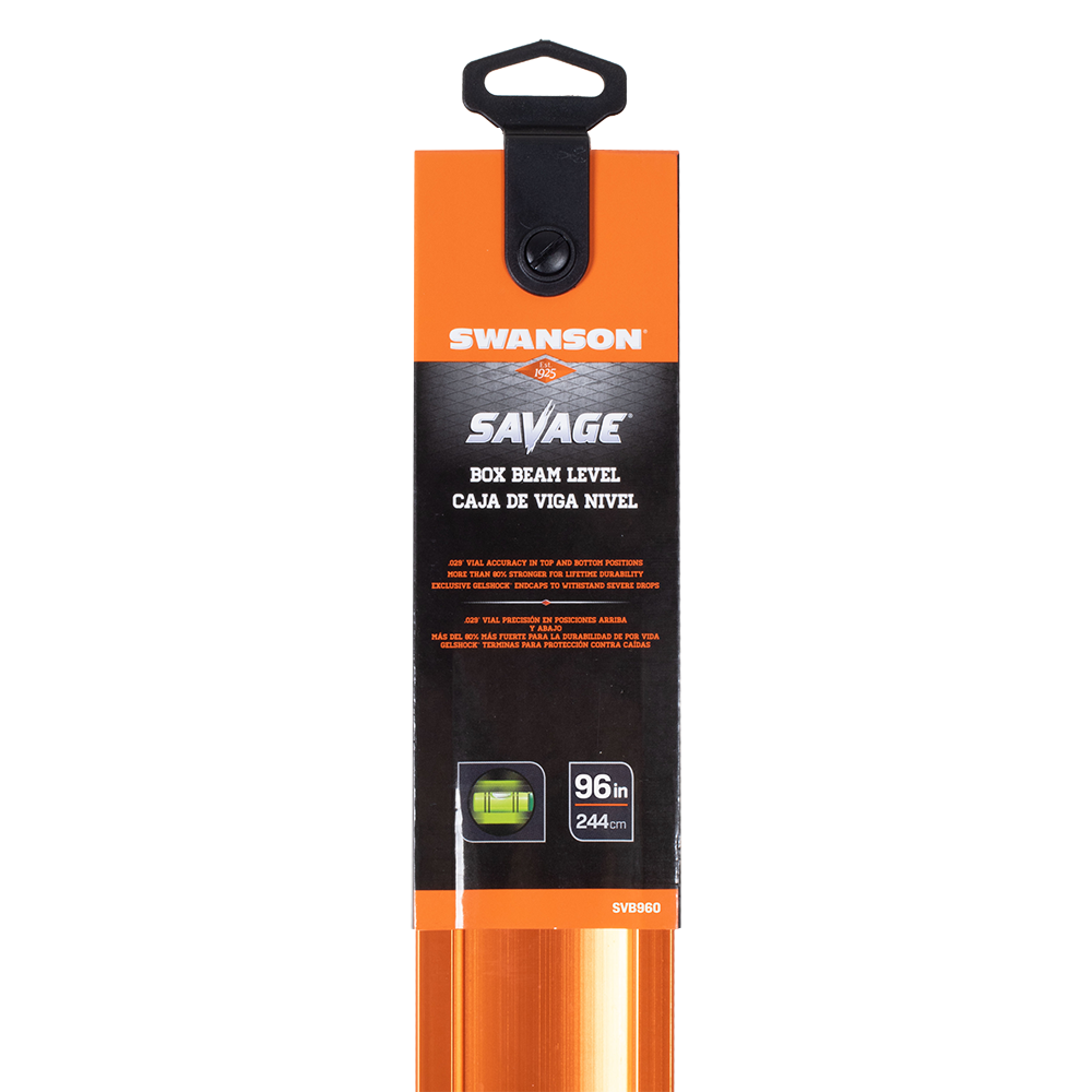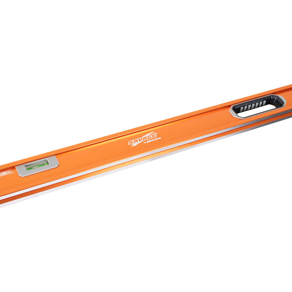 The SAVAGE™ Box Beam Level is renowned for its unparalleled accuracy and exceptional durability. Its name derives from the unique construction of the frame, which features a rectangular design visible when cut in half. This construction grants these spirit levels unmatched robustness. The level boasts a continuous dual rail frame, ensuring stability and precision. With a remarkable 0.029° vial accuracy, it guarantees accurate readings. The level is meticulously machined for optimal performance. It also features Supershock® end caps and Diamond™ bumpers, effectively preventing any marring. The Savage™ Strength Frame is 80% stronger than comparable models, providing superior strength and longevity. The level's acrylic block vials and multi-ring vials further enhance its precision and reliability.
