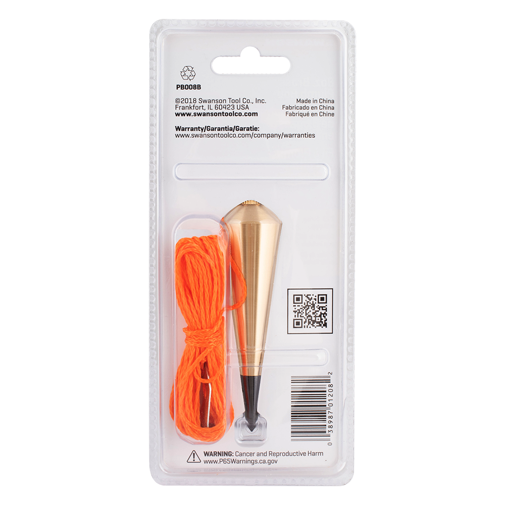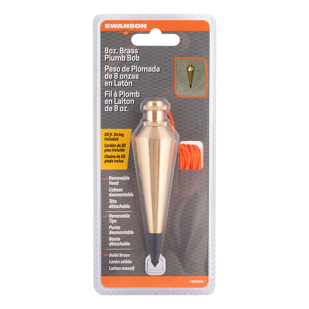 Swanson offers precision accurate, premium brass plumb bobs that boast solid spun brass construction, ensuring both weight and durability. These plumb bobs are equipped with a pointed tip and suspended by a string, allowing for the establishment of straight vertical lines, making them ideal for surveying, plumbing, and construction purposes. The replaceable hardened steel tip enhances reliability and can be easily screwed off for replacement. The steel tip also features a through hole that facilitates effortless tightening. With a removable screw top design, attaching the string to the center of the plumb is simplified. Weighing 8 oz, these plumb bobs come complete with a 20ft (6.09m) long fluorescent orange string.