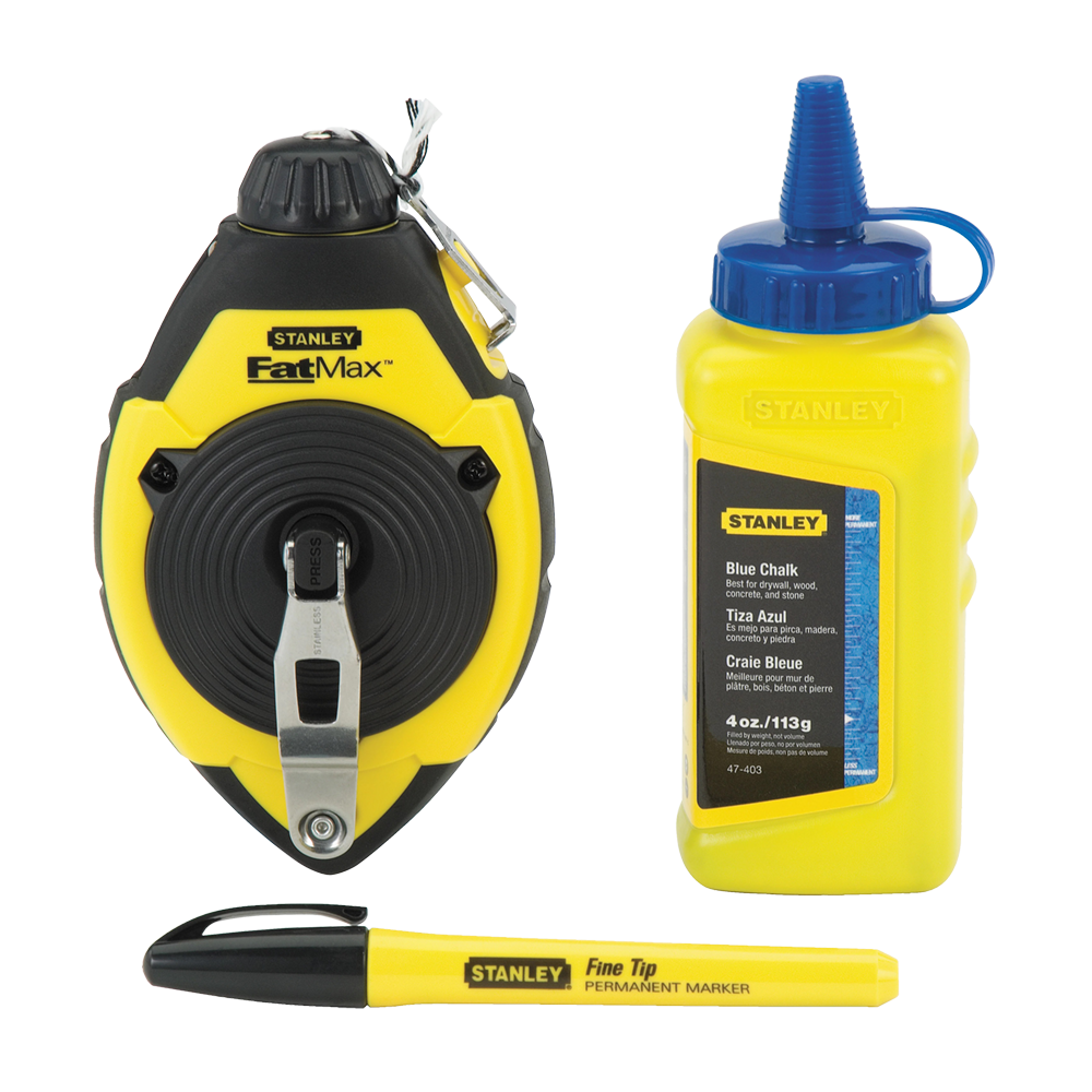 A 30m 3 : 1 fast return chalk line reel with 110g chalk refill and a line level as a lay out set combination.