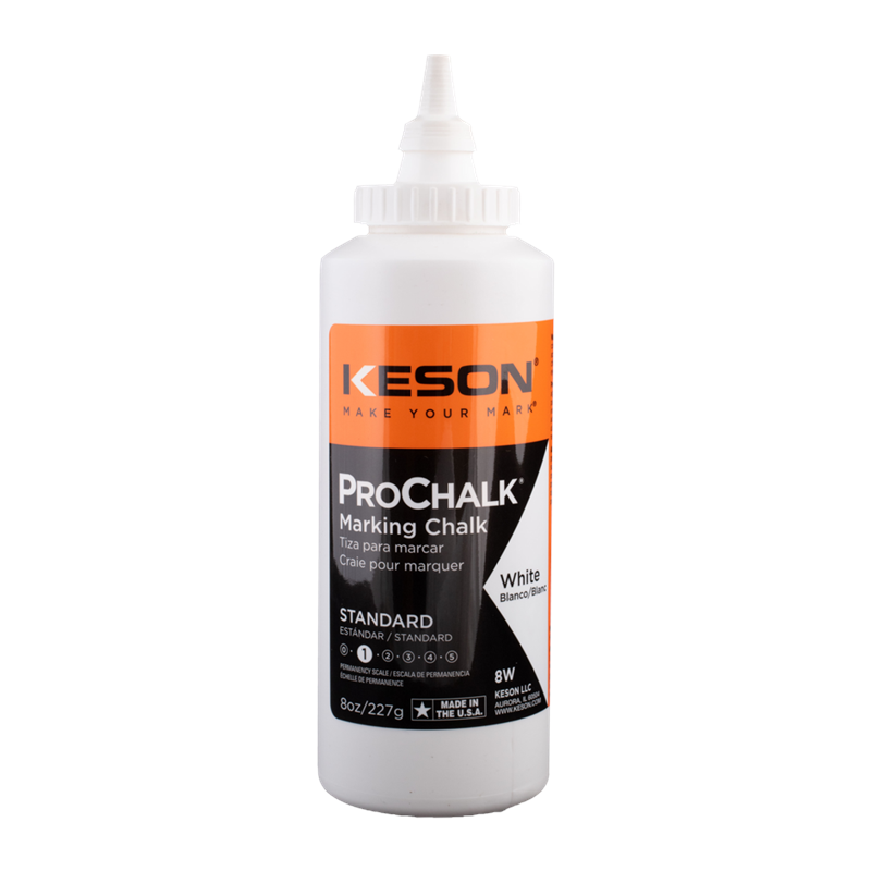 Keson ProChalk® High Visibility Yellow Marking Chalk is a high-quality marking chalk that is proudly made in the United States. This marking chalk is designed for exterior applications such as corrections, plumbing, electrical, roofing, and masonry. It is ideal for highly visible applications that will wear or wash away naturally in a few days. The chalk has a permanence ranking of 2, which means it will last longer than other temporary marking chalks, but still fade away over time. This product comes in a convenient 227g (8oz) bottle, making it easy to use and transport to job sites. Whether you are a professional contractor or a DIY enthusiast, Keson ProChalk® High Visibility Marking Chalk is a reliable and effective option for your marking needs.