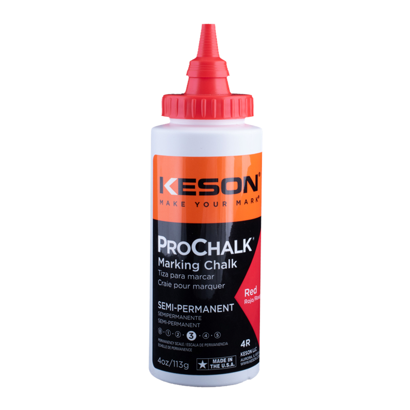 Keson ProChalk® Standard Blue Marking Chalk is a high-quality marking chalk that is proudly made in the United States. It is a versatile product that can be used for a variety of applications such as interior layout, roofing, siding, and paneling, both for interior or exterior use. This chalk is perfect for your basic chalk line needs that are easier to clean up or let wear away naturally. Its permanence ranking of 1 ensures that it will not leave behind any residue, making it ideal for use on surfaces that need to be kept clean. This product comes in a 113g (4oz) bottle, making it easy to carry around and use on any job site. Overall, Keson ProChalk® Standard Marking Chalk is a reliable and practical choice for anyone in need of high-quality marking chalk.