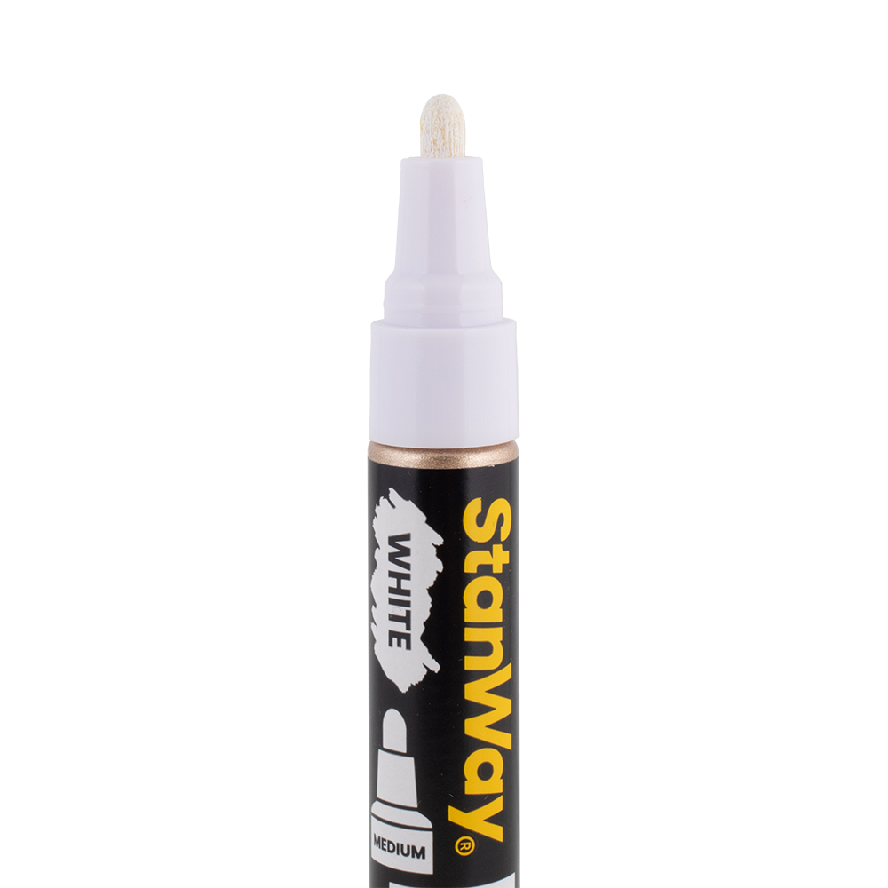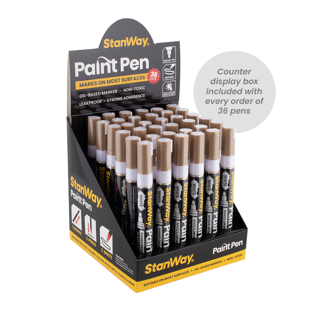 Stanway Paint Pens are oil-based paint markers suitable for use on a wide range of surfaces, including glass, ceramic, leather, wood, metal, plastic, and more! They feature a non-toxic, xylene-free formula and leakproof technology. The ink offers strong adherence and is both fade and weather resistant, making it suitable for indoor and outdoor use. Each pen has a medium bullet tip and produces bright, vibrant colours. They are simple and easy to use: shake the pen, press the tip to activate the ink, and write!