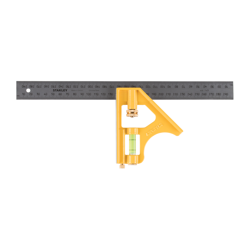 A standard multi-purpose combination square for use as an outside and inside try square. Mitre square. Depth and marking gauge. Steel rule and spirit level giving 45 degree and plumb readings.