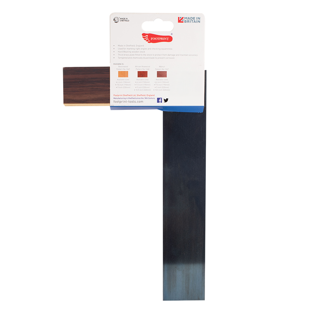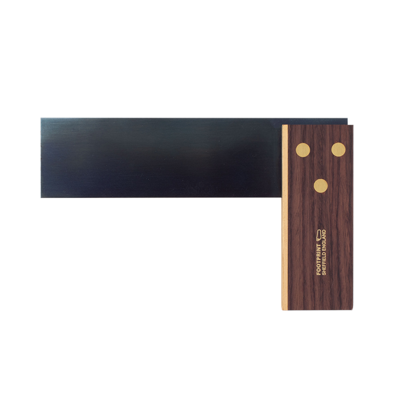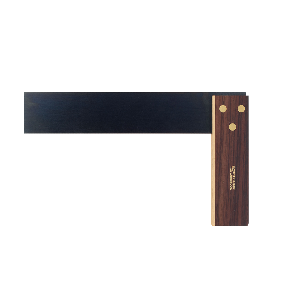 Footprint Carpenter’s Try Squares are used by Craftsmen all over the world to mark and check right angles on wood and joints. Each square features a hardened steel blade that has been chemically blued to resist corrosion. Additionally, the blade is securely fixed to the stock with three brass rivets. The stock is crafted from durable African Rosewood (Bubinga), known for its hard-wearing properties, and features a brass plate on the face to maintain squareness and extend the tool’s lifespan. Proudly made in Sheffield, Britain.