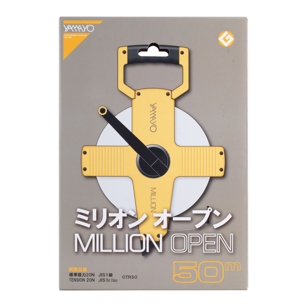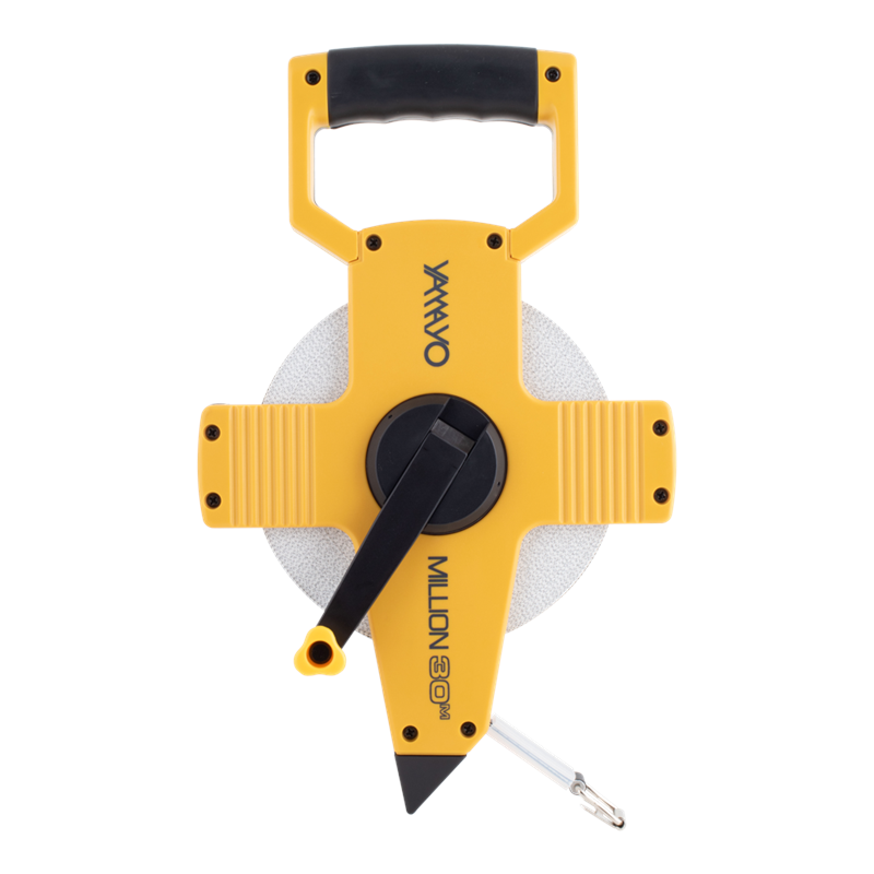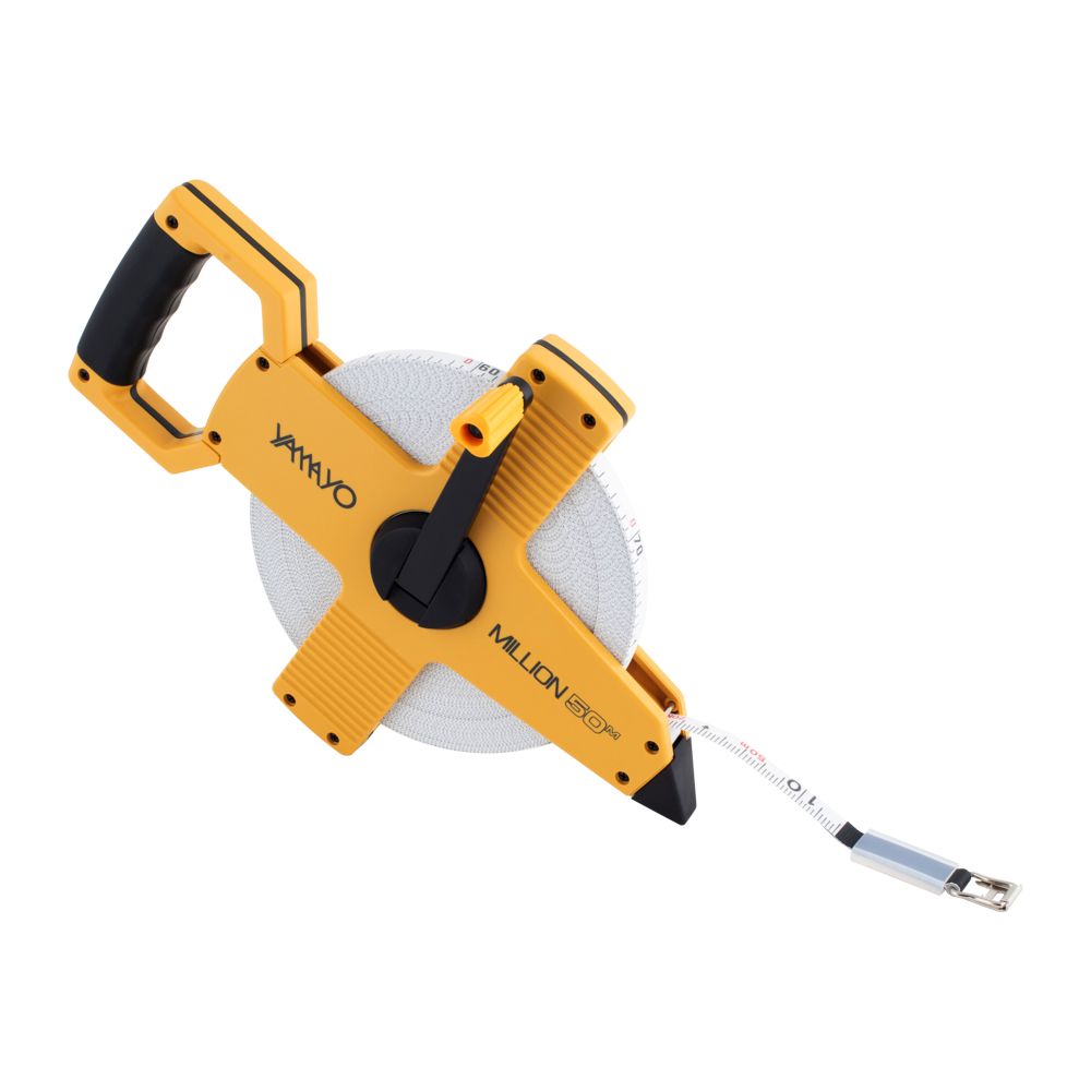 The Yamayo "Million" Long Measuring Tape is a robust tool designed for precision and durability. Featuring a fibreglass core coated with protective white PVC, it is housed in an ABS open reel for added resilience. Engineered to endure rugged use, it resists tearing and withstands extreme weather conditions, ensuring longevity. The tape boasts high accuracy and visibility, with weather-resistant properties and easy cleaning in water. Ultraviolet-fixation permeating ink keeps the markings intact for years. Its non-conductive blade, made from two non-conductive materials, ensures safety. Starting at zero from the hook blade, it guarantees precise and reliable measurements.
