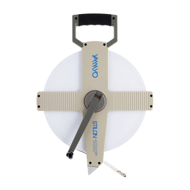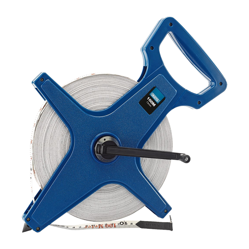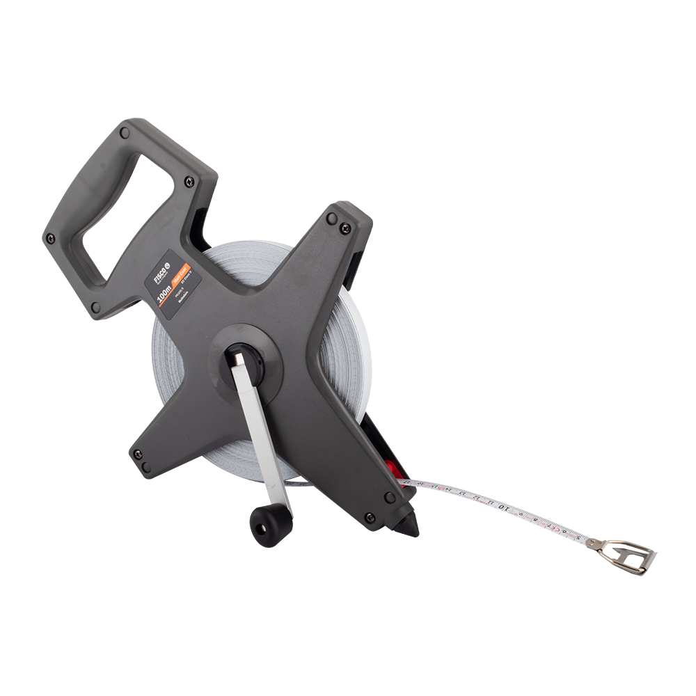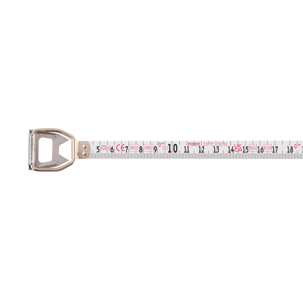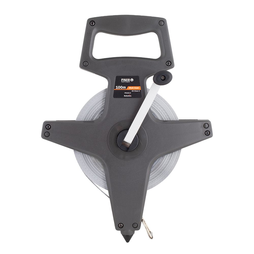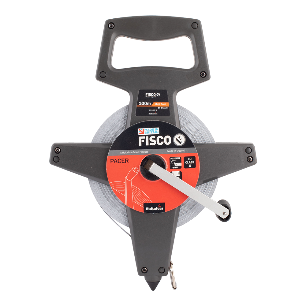 The Fisco Pacer Long Measuring Tape is a heavy-duty, high specification open-frame tape designed for the professional user. This tape measures 100 meters in length and 13mm in width. The tape is made from a "Matt Coat" tough, white polyester coated steel material that is resistant to commonly used solvents and abrasion, ensuring it can withstand harsh working environments. It is also accurate to EC Class II, graduated in mm, numbered in cm every cm, and marked with red metres and repeats. The tape is made in Britain and features an impact-resistant ABS frame with an integral ground spike, and a tough, high-impact polymer center that offers additional strength to the winding mechanism. The low friction bearing ensures smooth rewind, while the long winding lever and easy-grip knob make rewinding fast and effective. Finally, the tape features a corrosion-resistant end-piece with a pressed steel end-loop fitted with a stainless steel claw.
