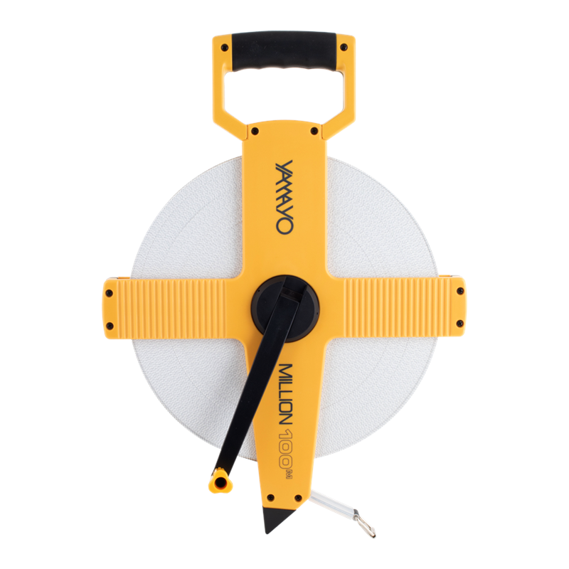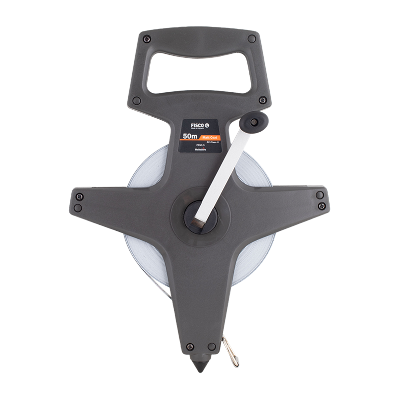 The Fisco Pacer Long Measuring Tape is a heavy-duty, high specification open-frame tape designed for the professional user. This tape measures 100 meters in length and 13mm in width. The tape is made from a "Matt Coat" tough, white polyester coated steel material that is resistant to commonly used solvents and abrasion, ensuring it can withstand harsh working environments. It is also accurate to EC Class II, graduated in mm, numbered in cm every cm, and marked with red metres and repeats. The tape is made in Britain and features an impact-resistant ABS frame with an integral ground spike, and a tough, high-impact polymer center that offers additional strength to the winding mechanism. The low friction bearing ensures smooth rewind, while the long winding lever and easy-grip knob make rewinding fast and effective. Finally, the tape features a corrosion-resistant end-piece with a pressed steel end-loop fitted with a stainless steel claw.