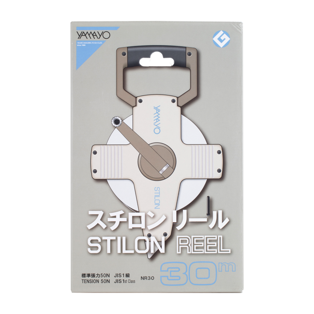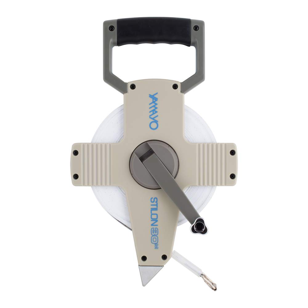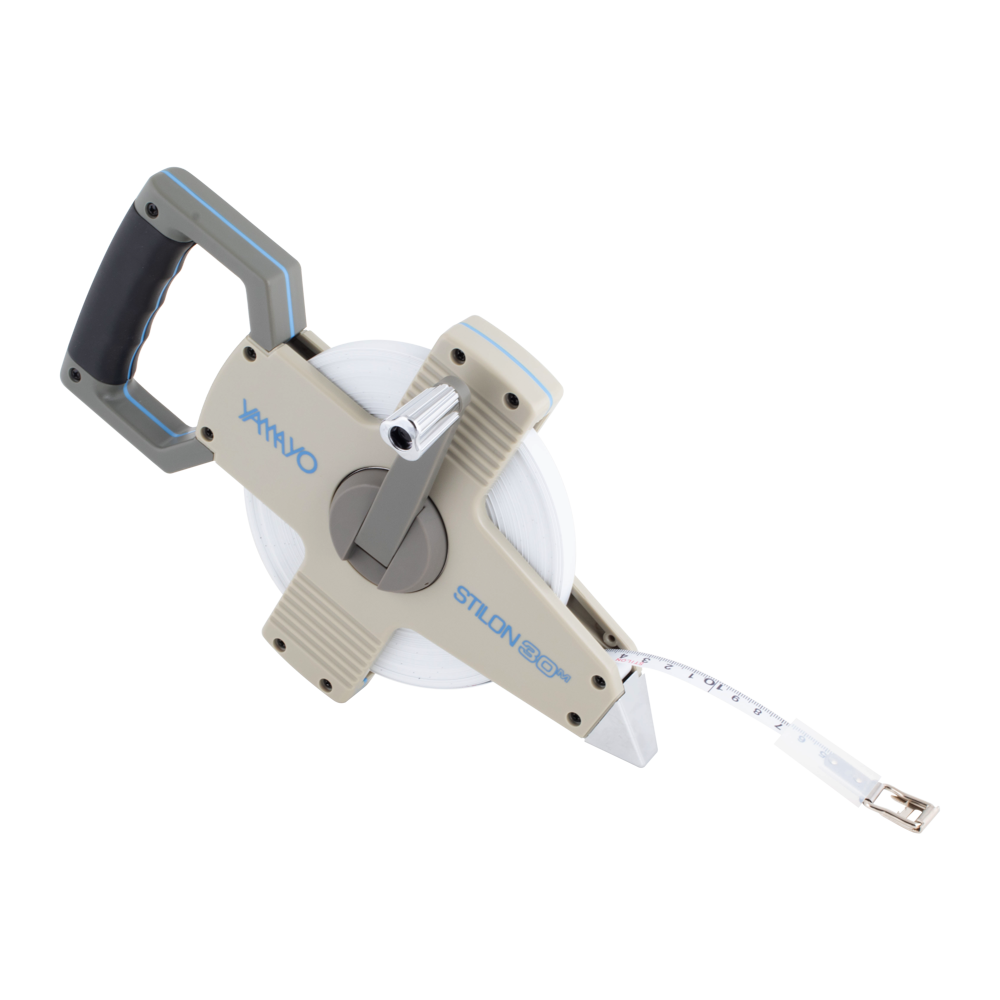 The Yamayo "Stilon" Long Measuring Tape features a high carbon steel core coated with thick white nylon, encased in a durable ABS open reel. This robust construction, enhanced by a water-resistant clear coating, ensures the tape is tough, durable, and non-rusting, even in harsh conditions like seawater. Its sturdy edges significantly extend the blade's lifespan, making it unbreakable even when bent acutely, stepped on, or run over by a truck. Unlike ordinary steel tapes, it remains intact under extreme stress. The tape starts at zero from the hook (type E) blade, making it precise and reliable for all measuring needs.