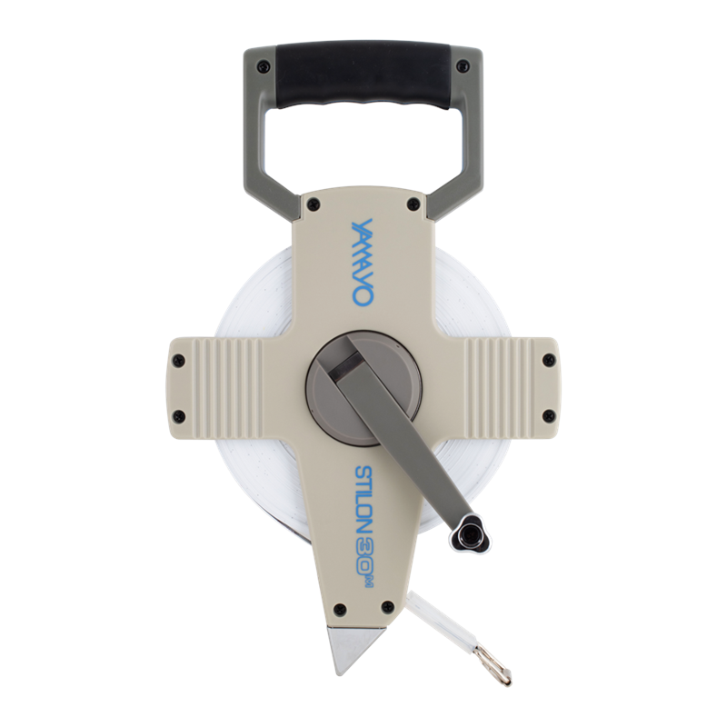 The Yamayo "Stilon" Long Measuring Tape features a high carbon steel core coated with thick white nylon, encased in a durable ABS open reel. This robust construction, enhanced by a water-resistant clear coating, ensures the tape is tough, durable, and non-rusting, even in harsh conditions like seawater. Its sturdy edges significantly extend the blade's lifespan, making it unbreakable even when bent acutely, stepped on, or run over by a truck. Unlike ordinary steel tapes, it remains intact under extreme stress. The tape starts at zero from the hook (type E) blade, making it precise and reliable for all measuring needs.