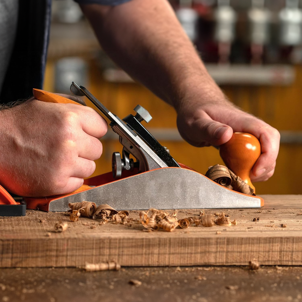 Based on the Classic Stanley Bedrock design, this is the standard-size smoothing plane. Blade is made from extra-thick 1/8 in. O1 steel for excellent edge retention and solid chatter-free cutting. The blade is ground with a 25° bevel and bedded at 45° with the bevel down. The hardwood front knob and rear handle provide excellent control and comfort. The Jorgensen No.4 smooth plane is ideal for general smoothing, finish work and trimming parts. Heavy gauge (3mm) Pro O1 Steel blade is more durable and provides a solid cut with minimal vibration. Ductile iron is far stronger and more resilient. Stress relieving metal ensures the machined casting will stay flat over time.