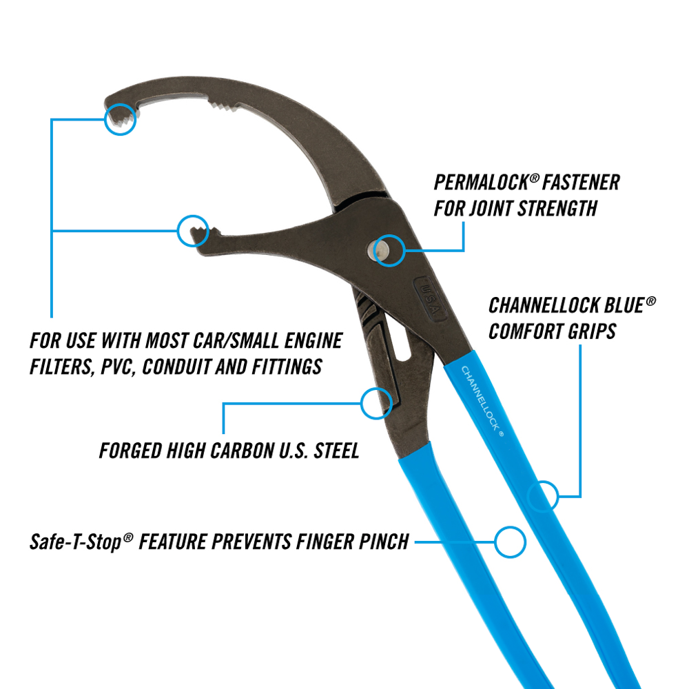 Channellock Oil Filter/PVC Pliers combine the strength and reliability of our iconic Tongue & Groove Pliers with the special needs of PVC and oil filters. The 212 has a jaw capacity of 2-1/2 In. to 3-3/4 In. and removes stubborn oil filters from cars, trucks, motorcycles, ATVs and lawn and garden equipment. Channellock Oil Filter/PVC Pliers are made in USA and forged from high carbon U.S. steel that is specially coated for ultimate rust prevention.