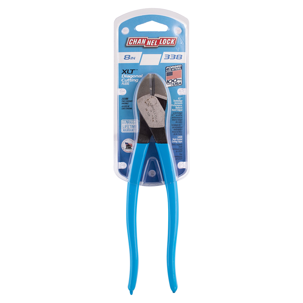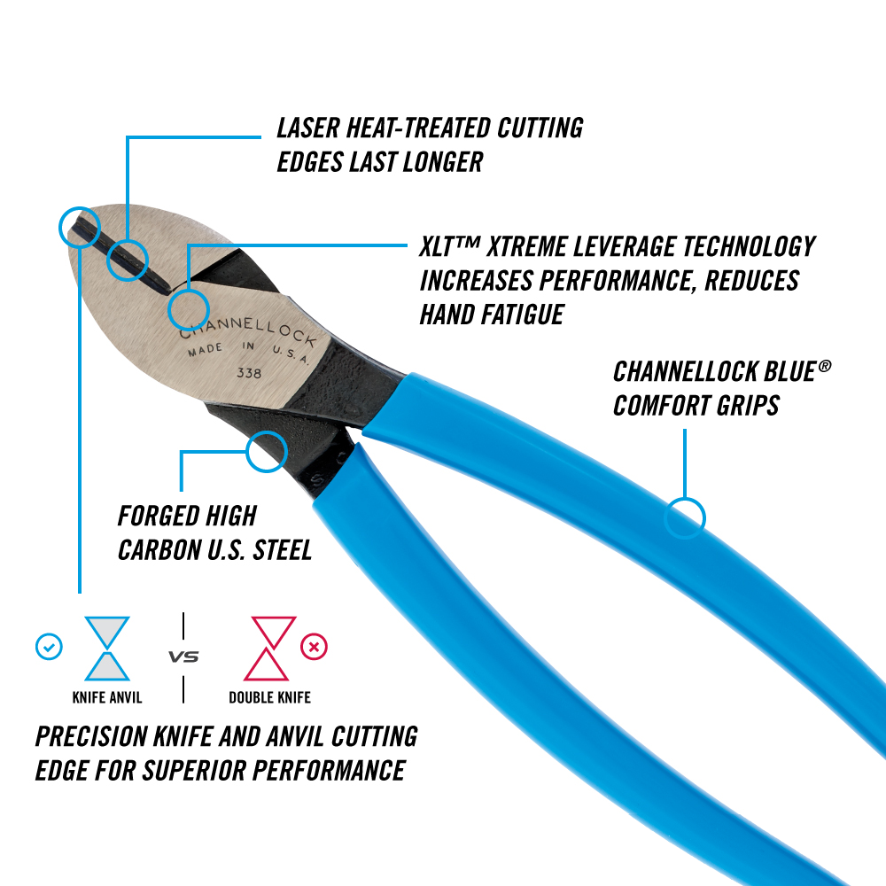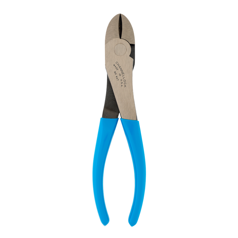 Channellock High Leverage Diagonal Cutting Pliers feature Xtreme Leverage Technology (XLT™) which makes cutting easier than ever. By positioning the rivet closer to the cutting edge, considerably less force is required to cut than other high leverage designs. State-of-the-art laser heat treating offers a strong and consistent pattern across the cutting edge for increased strength and longevity. These pliers also offer a slimmer, lighter, and better-balanced design for maximum performance and accessibility. Diagonal Cutting Pliers are made in USA and forged from high carbon U.S. steel that is specially coated for ultimate rust prevention.