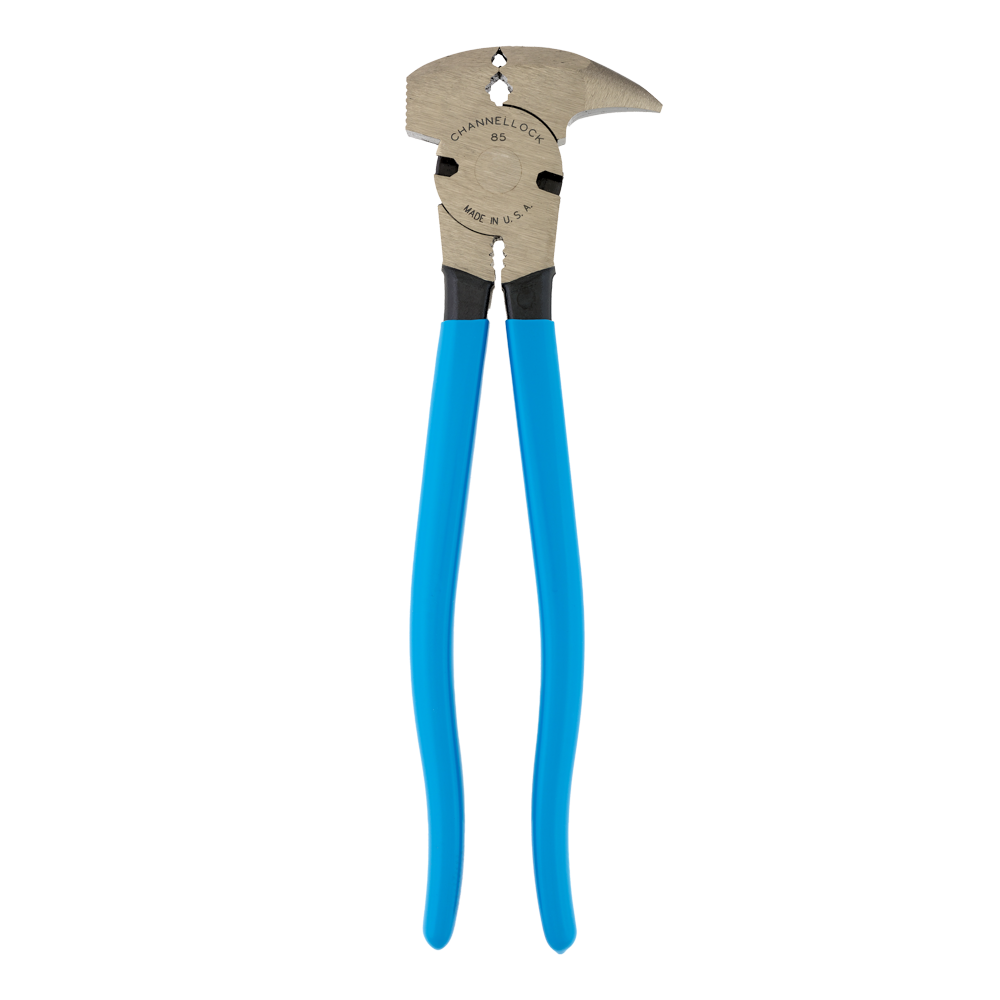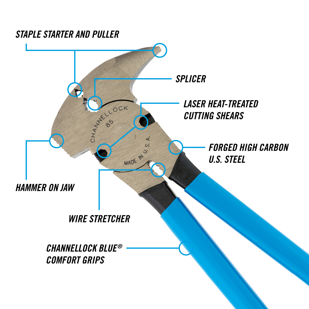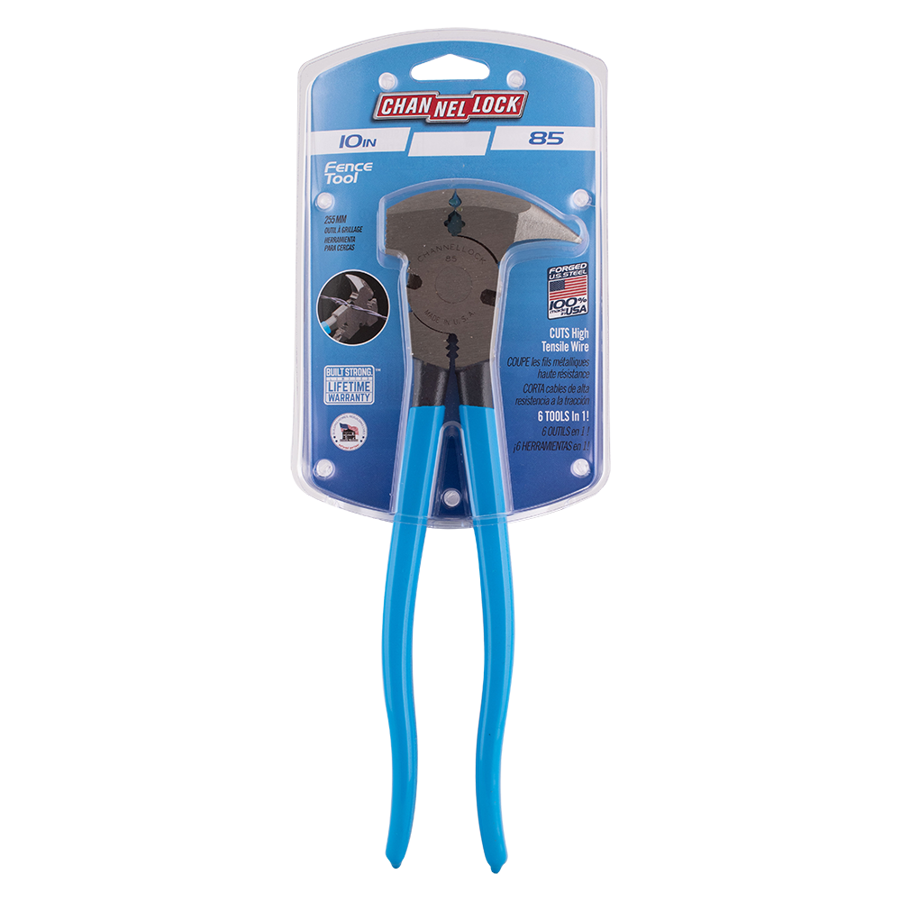 The Channellock 10-inch Fence Tool combines 6 features in 1 reliable tool for fencing installation, repair, and maintenance. Channellock uses laser heat-treating technology to harden two wire shears so you can cut High Tensile wire with ease and confidence. Other features of the Channellock Fencing Plier include a Hammer and Starter for staple install as well as a Claw plus Puller for staple removal and wire stretching. Also included, a precision-machined Crimping nest and Wire Splicer. The Channellock model 85 Fence Tool is 100% Made in USA and Forged from High-Carbon U.S. Steel.
